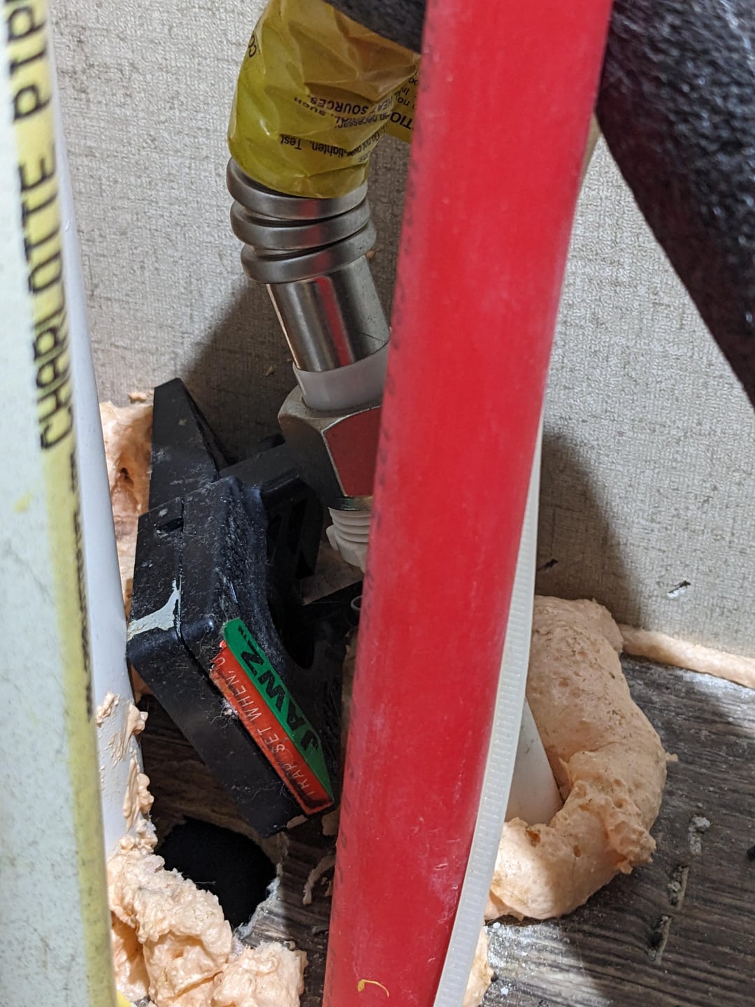 While looking at this main hole I noticed one of our missing mouse traps is on top of the hole, caught in the plumbing, unsprung. The trap was moved probably 4 feet from where it was.