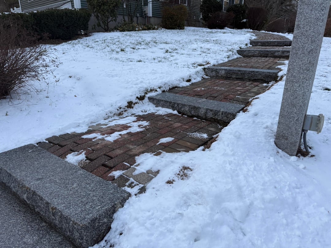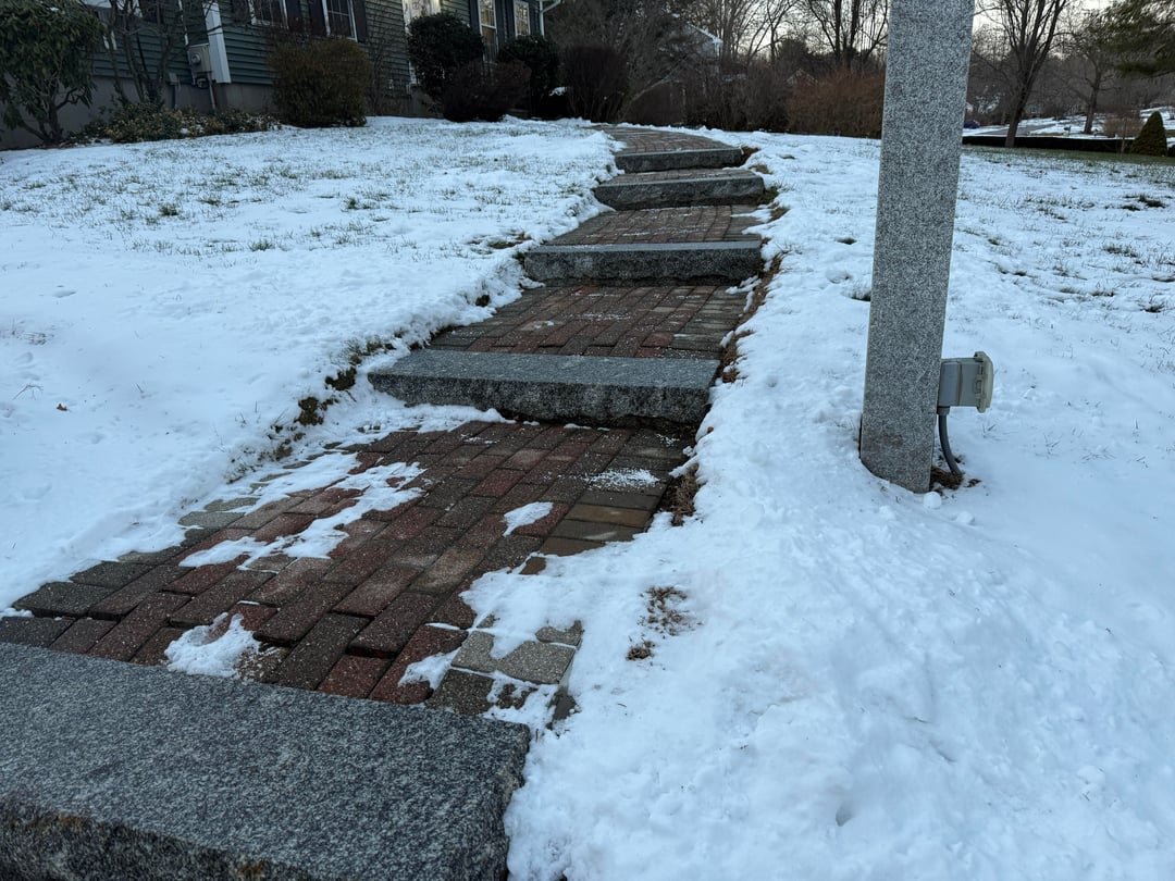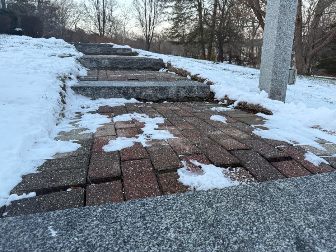 That sagging is a classic case of base failure and it is almost certainly happening because of water management issues behind those granite risers. When rain or meltwater runs down that slope it hits the back of the solid step and starts eroding the bedding sand underneath the pavers because it has nowhere else to go. Combine that with the freeze-thaw cycle you are obviously dealing with given the snow and the ground heaves up and settles back down unevenly leaving you with those ankle-twisting dips.