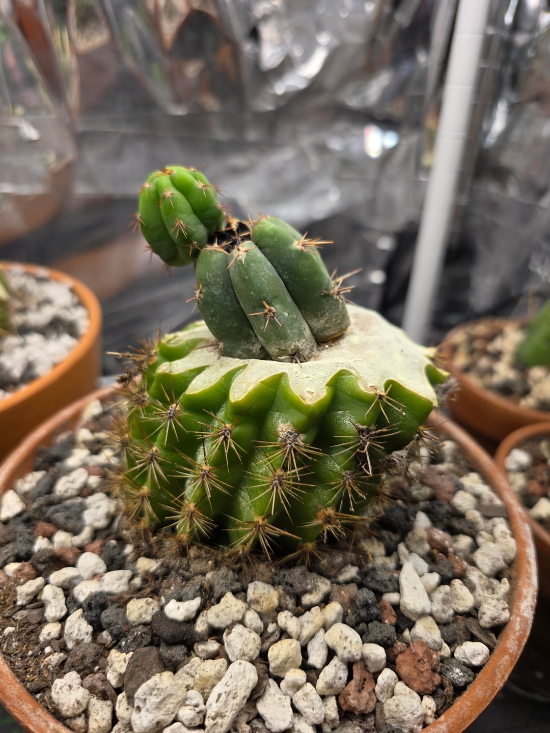 Grandi and sungoddess can be a bitch lmao but I’ve found thick cardboard or normal stuff doubled up or a shirt bunched up or a rag any of these options almost like a vertical cutting board hold the side of the cactus with it an cut into the cactus and straight at the cardboard but be careful your not cutting anything but the cactus so too much of a swipe and your ganna catch your hand especially with a good knife hence why I say double up , this method has given me better flat cuts for the sungoddess I’ve found them to be more effective then grandi but they both do great work pumping the scion. Looking good tho you’ll start to see your work get better and better the more ya give it a shot 🫡🤘💪💚🌵