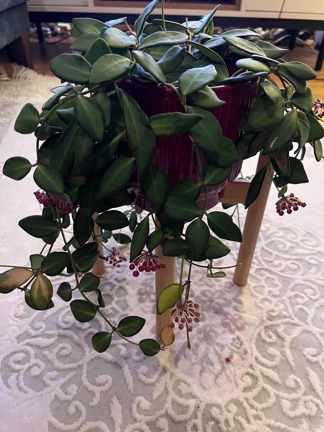 This hoya I bought in Dec 2023 has been growing steadily since I moved into a west facing apartment last June and it bloomed for the first time shortly after that (I love the scent!) As it’s my first hoya, I didn’t really know they needed trellisis until recently, and now I’m wondering if it’s too late to use one? Today I tried wrapping it around a u-shaped trellis but the leaves are too dense for it and I don’t think I’ll be able to fit all the branches around it. I also have a small grid type trellis which again seems too small for the plant.