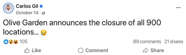 A rumor that circulated online ifrom October to December 2025 that Darden Restaurants, the owner of Olive Garden, planned to close all of the Italian chain eatery’s 900-plus locations.