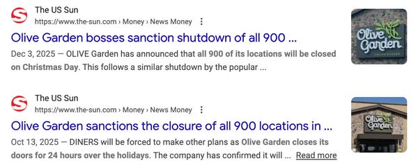 Weeks later, on Dec. 3, The Sun published another article with a headline that displayed in Google search results as “Olive Garden bosses sanction total shutdown of all 900 …” The full headline read: “Olive Garden bosses sanction total shutdown of all 900 restaurants for 24 hours – and it’s just weeks away.”