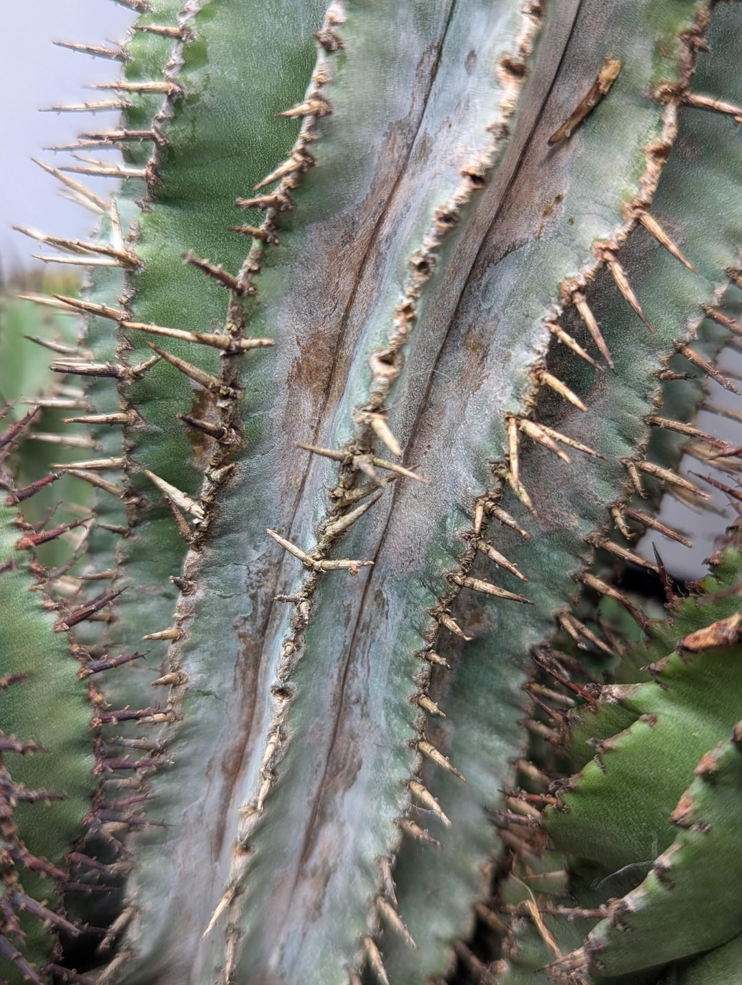 Picked this one up from Home Depot a month or two ago. Noticed some discoloration when I bought it but assumed it was some damage/scarring from transport, especially since there was some sap on the discolored areas. Noticed a week ago the spines in the area looked abnormal and decided to spray down the largest individual with 70% isopropyl and isolate.