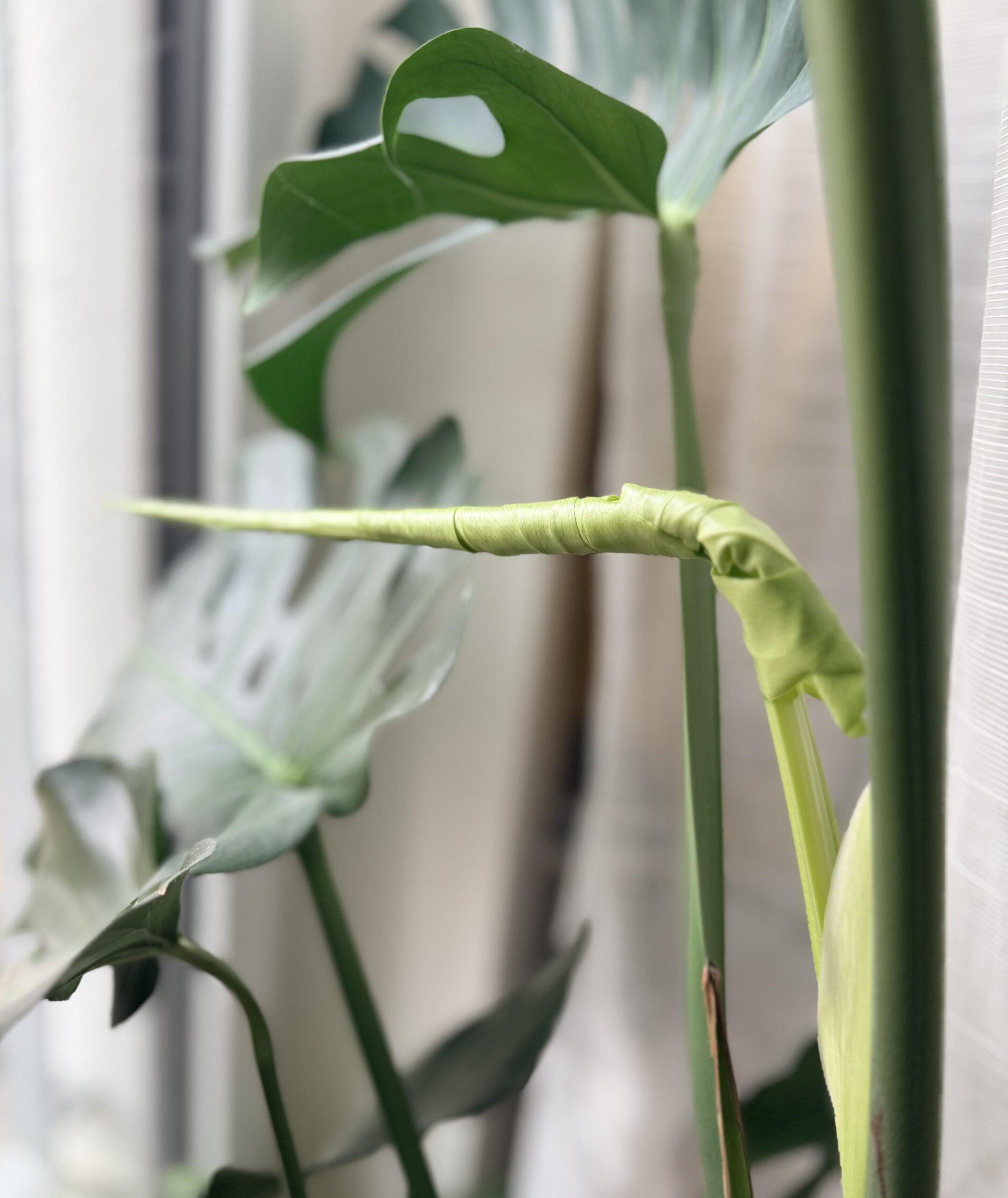 But then this morning I saw this!! My little Monstera is pushing out a new leaf after more than 2 months of no signs. I’m extremely happy and proud of her🥹