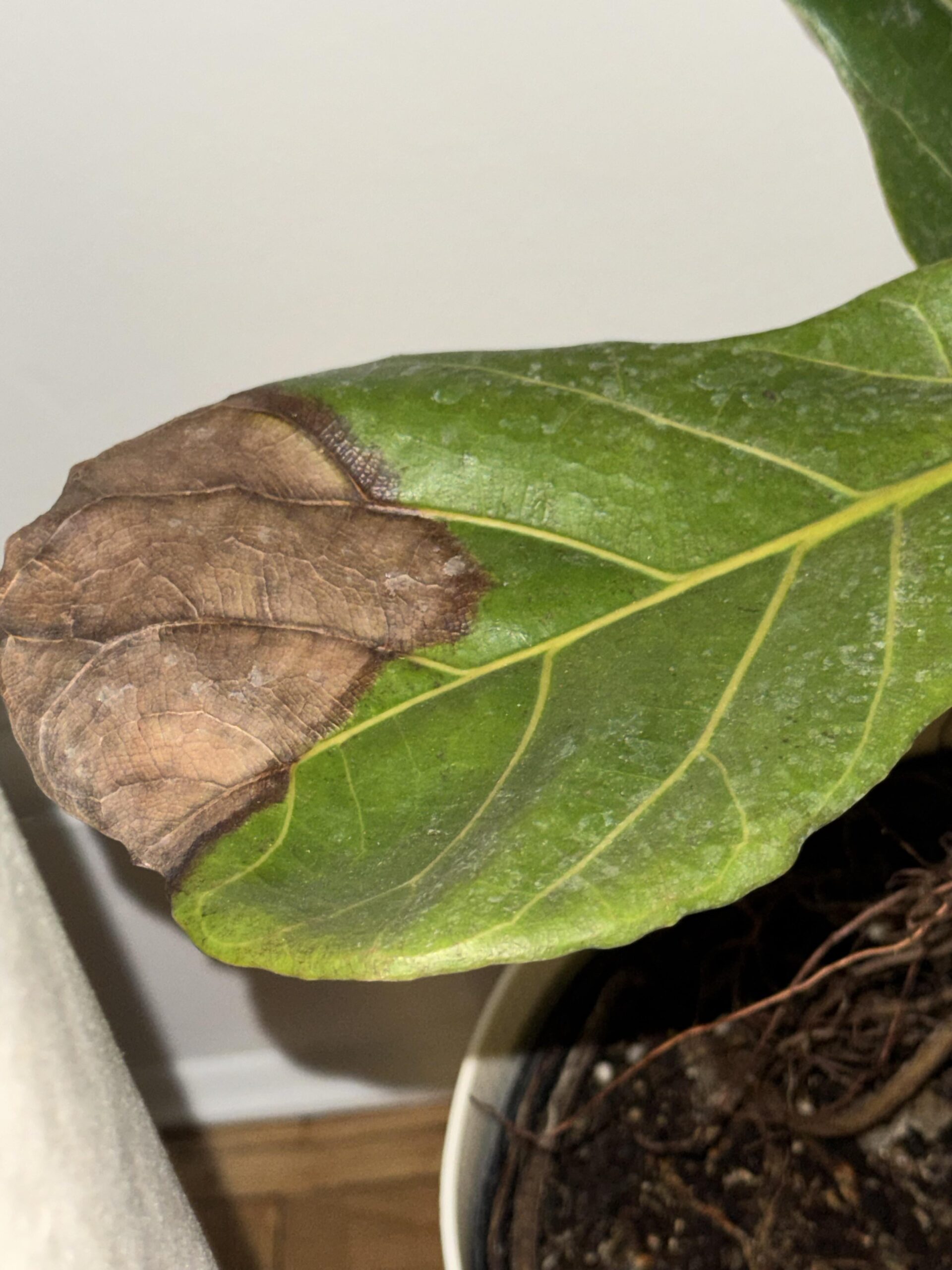 I have these brown spots that recently started showing up on the leaves of my fiddle leaf that is in a 10 inc pot. Is this because of low light or not enough water? I recently moved the plant to a more of a shady part of the house with less light so I’m thinking that might be the reason? I water it about 24oz of water every 7-8 days when the top soil is dry