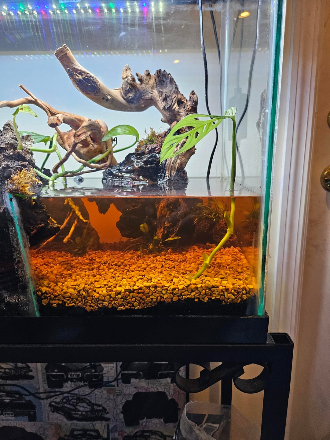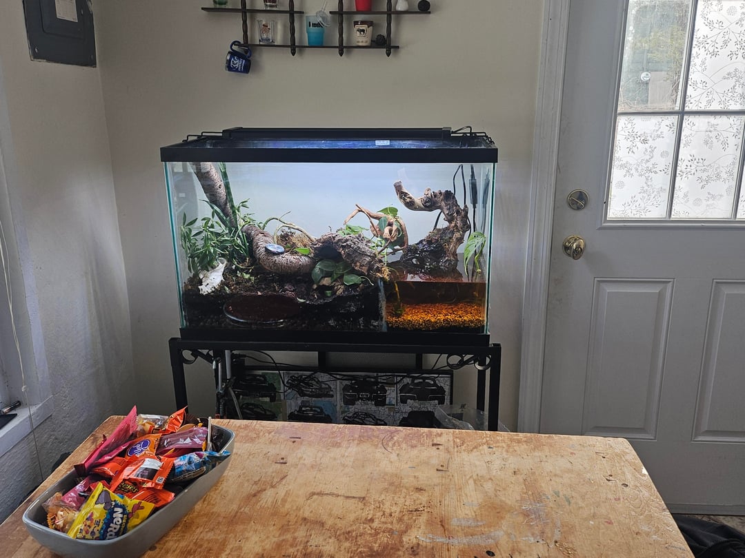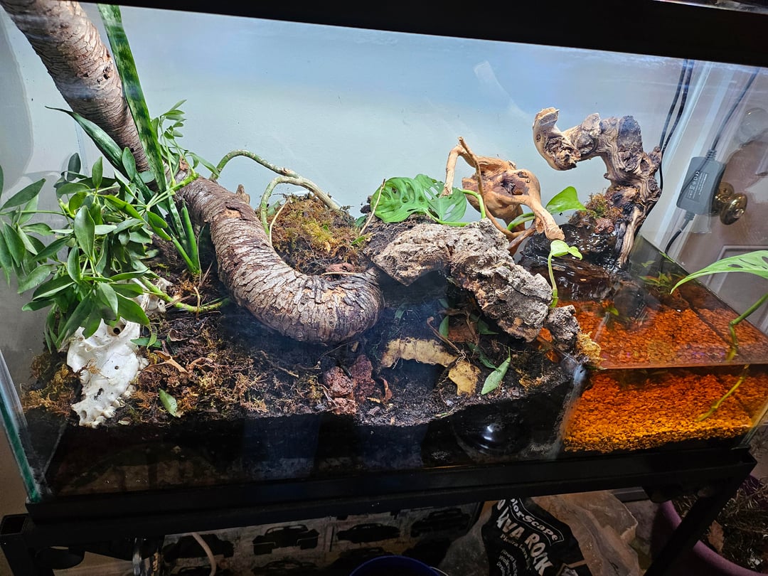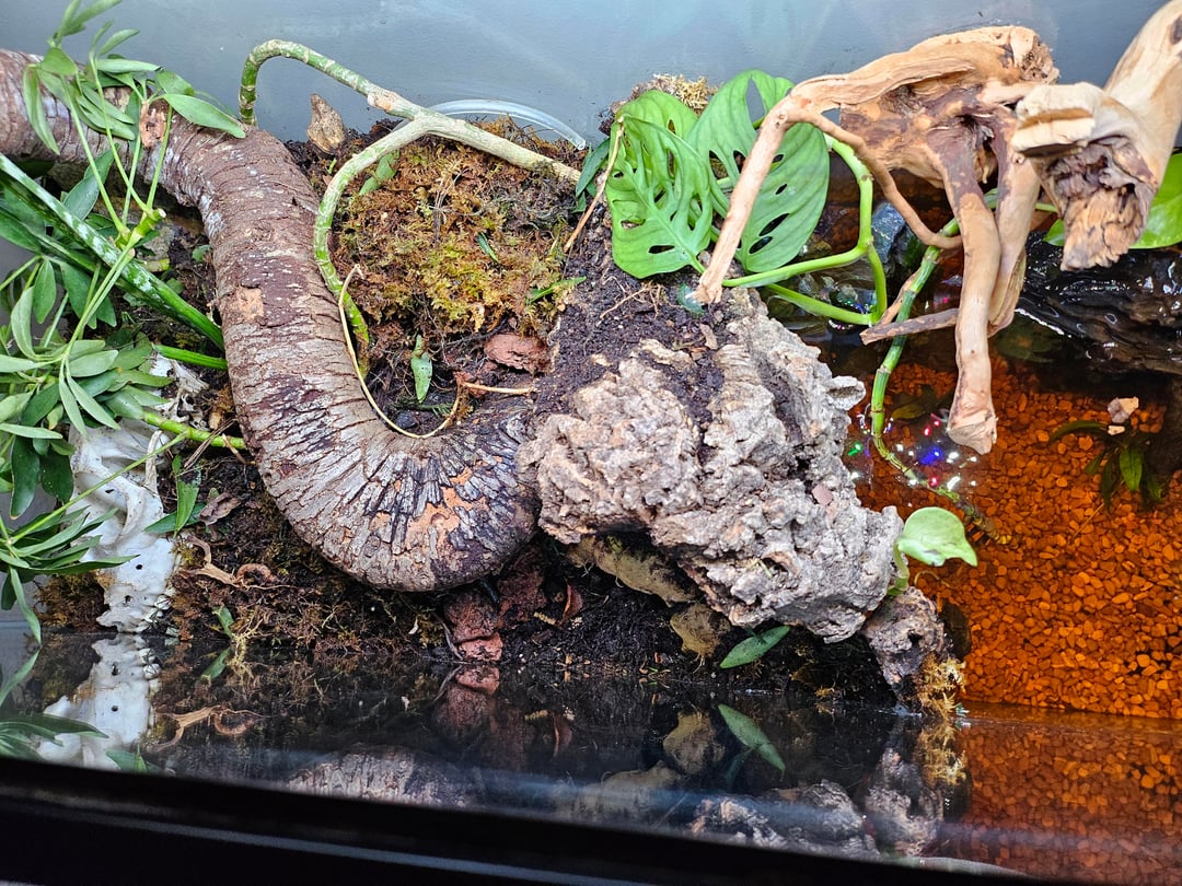 New setup, still cycling. Old pics, there are more plants in water now. Aquatic side is 2.5 gallons, 78 degrees stable. no heat on land side but that can change.