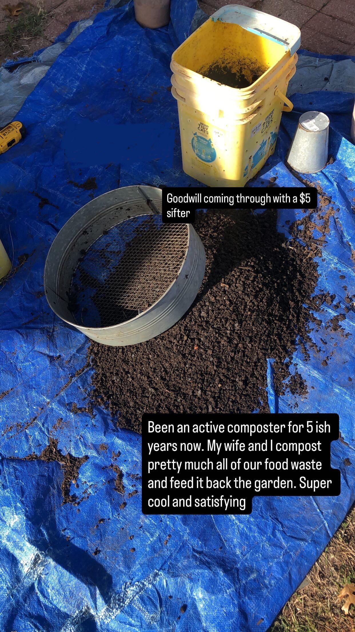 Drop at the top, gravity does the work, the big chunks go back in the bottom bin as top dressing or back in the compost. The wood is attached to the screen with staples from a manual staple gun, super cheap build. Best of luck!