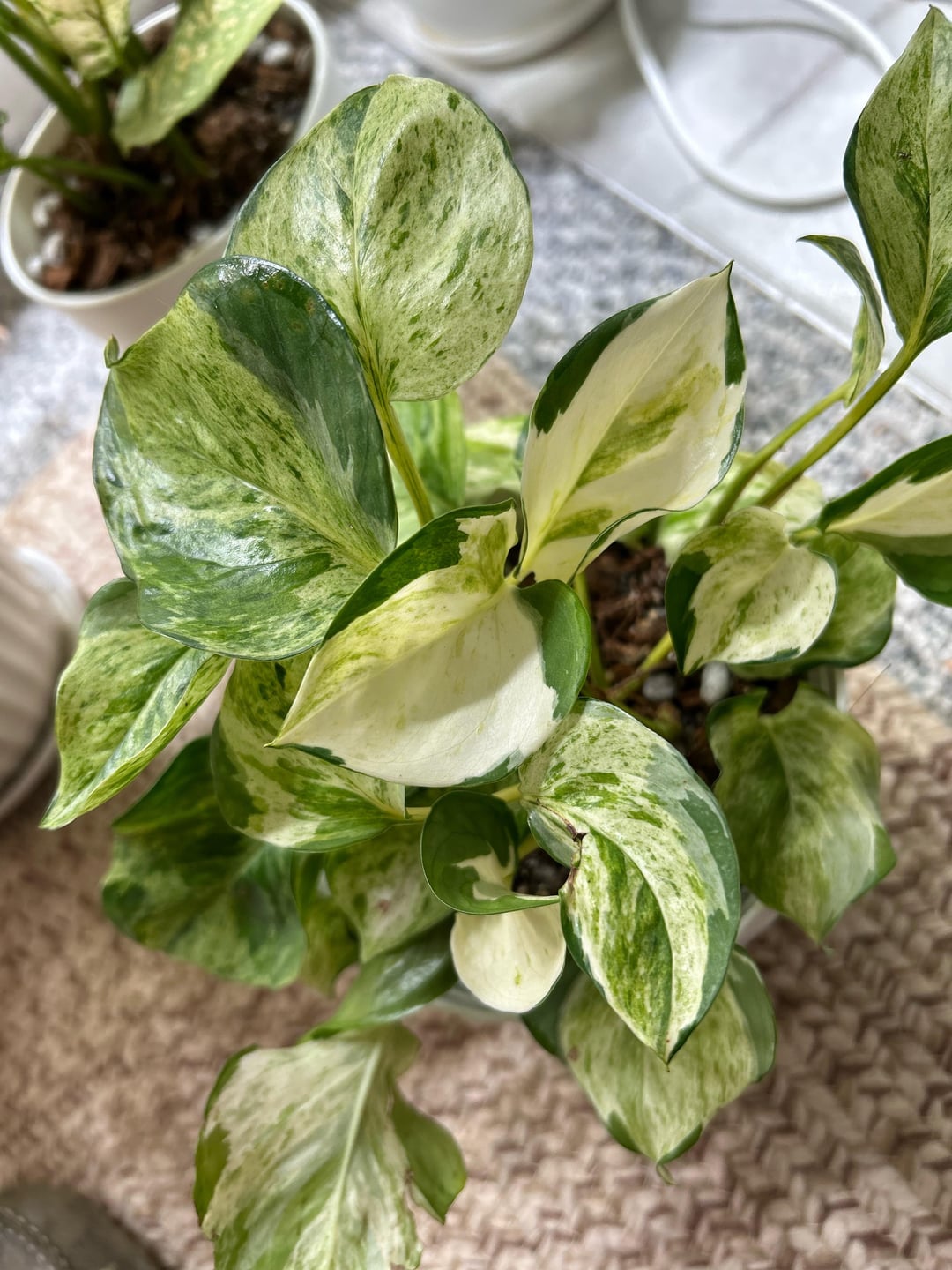 As to the question of ID: Is the harlequin manjula just high variegation on a regular manjula (like the snow vs marble queen relationship)? Because I don’t think it looks any different from my regular manjula (3rd photo). I would even argue that the variegation on the regular manjula has more of what I consider harlequin characteristics than the one I bought as a harlequin. I already have more manjula than I know what to do with. I hate to think I’m working so hard to keep this one little sprig of the very same plant!