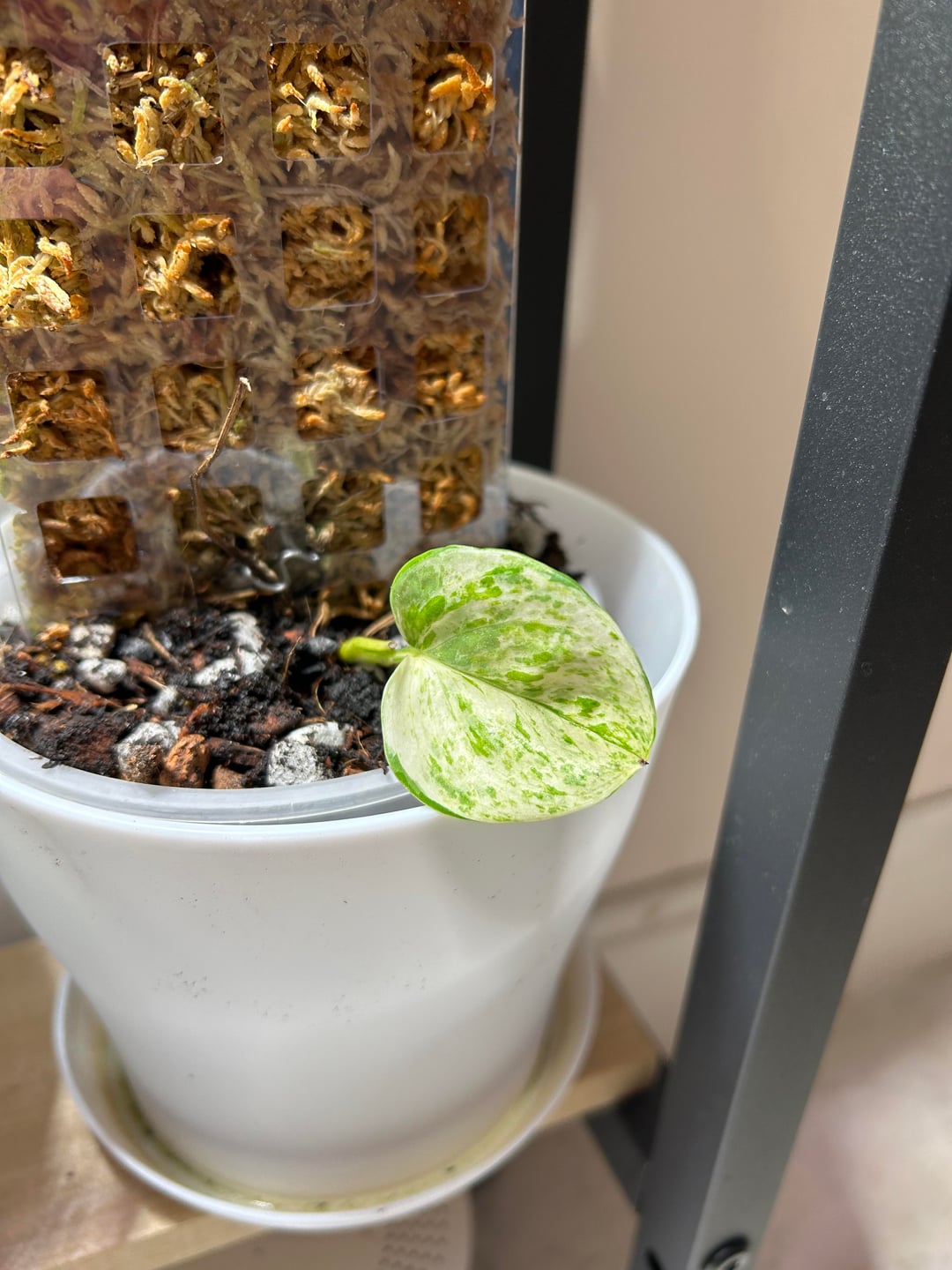 With nothing to lose, I stuck the rootless node and nearly dead leaf in a pot. Then the original leaf fell off. Then it grew a new leaf (1st photo)! Yes, there is a moss pole behind it. I already had it prepared for another cutting, and I figured I would be getting the pot back pretty quickly when this thing croaked. So now I have the tiniest pothos ever to be grown on a touchless moss pole. 😜 I’m afraid to do anything to it. I’m afraid of overwatering it. I’m afraid of underwatering it.