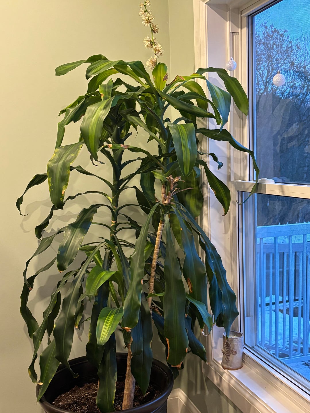 My corn plant is blooming for the second time. The first time it bloomed was 2 years ago and we were not prepared for how stinky it is! Some may enjoy the smell, but it’s quite strong. My husband crassly calls it my ‘hooker’ plant, because it opens at night and smells like cheap perfume. 😬😆
