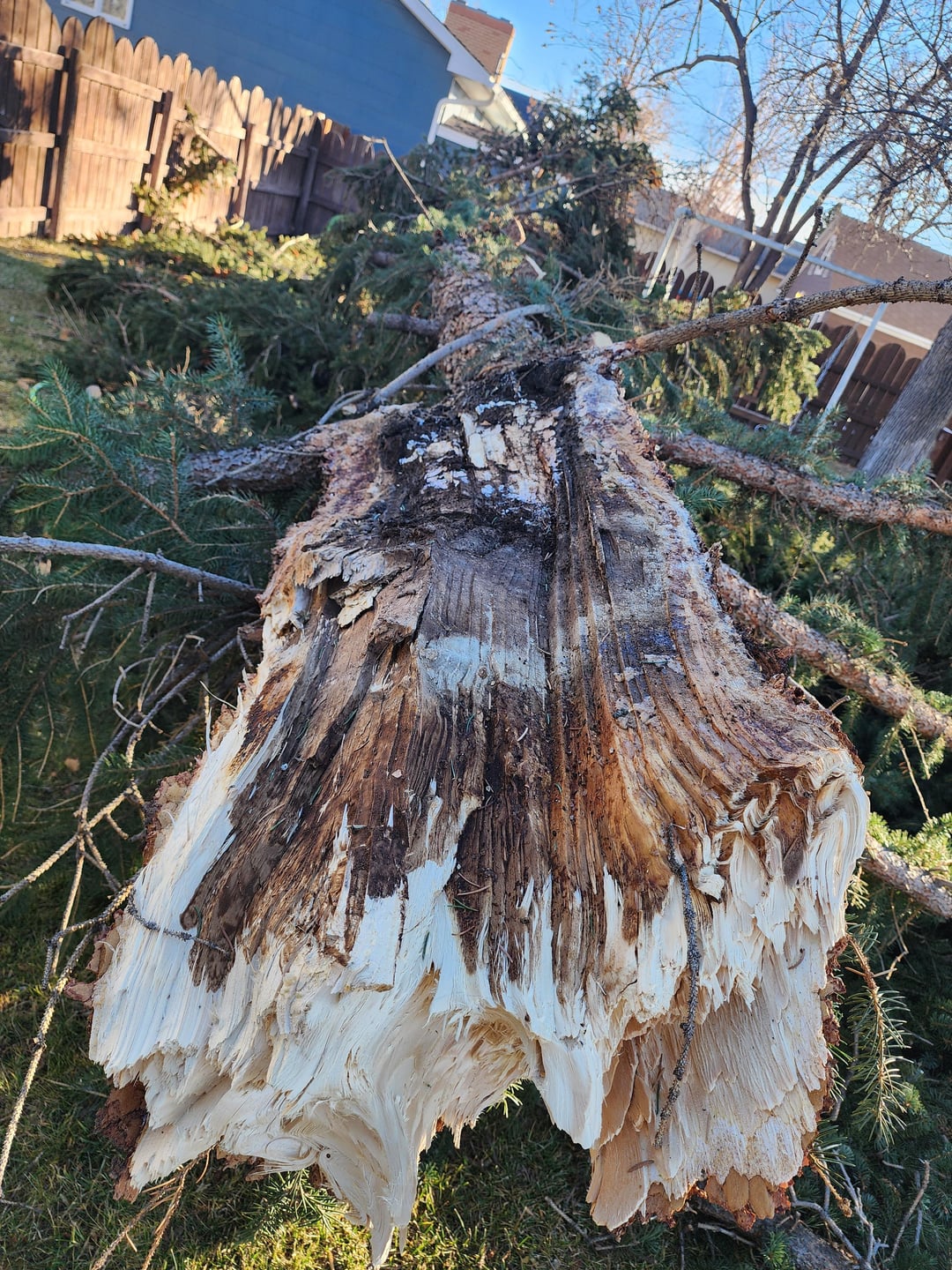 Good afternoon, Arborists! I'm in NW Montana, and we just had a massive wind storm rip through. It took this big side chunk out of our largest pine in the back yard that stands at 50-60 feet. I'm looking for insight on whether or not the tree will recover. There's still a fair amount of tree above the wound that, if it were to split there, would cause massive damage to our home. I've attached pictures of the fallen limb, a closeup of where it split off of the tree, a photo showing where it used to be on the tree, and another of the tree and limb in the same shot. What do you think? It's our favorite tree on the property, so I'd hate to lose it, but I've got a feeling that wound might not do well as we enter winter.