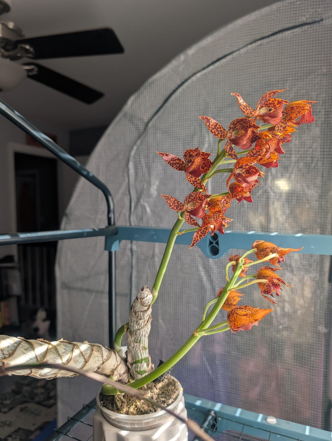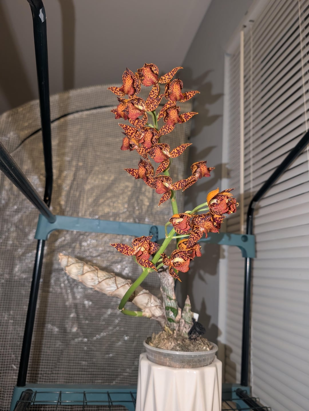 This is mormodes Roehampton Flame. This is my only pure mormodes in my collection. I almost lost this plant about 2 to 3 years ago to rot but I somehow manage to save it and it has been making a comeback ever since and I believe that this plant is in a healthy condition where I don't need to worry so much about losing it anymore.