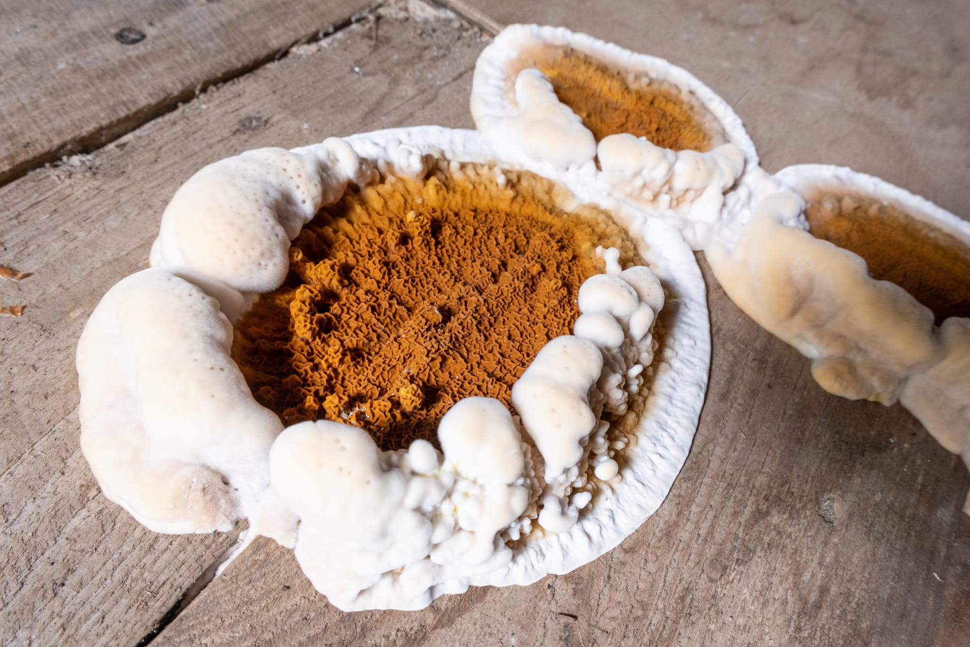 If they appear on sheds, pergolas or cabins, it signals existing wood rot. Left untreated, they can further weaken the timber. The caps are thin and usually 3cm to 5cm wide. They feature striking bands of brown, orange, green and beige.