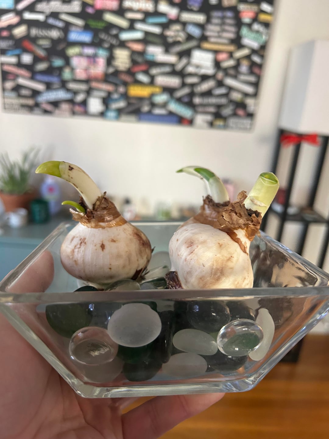 I have several paperwhite blooming now in my living room in 14″ wide pot with four big amaryllis. I prefer ro pot them properly with soil and slow release fertilizers, instead of using just water, so that they will recover and bloom again sooner when planted outside in spring, but the water method works as long as you’re ok with them skipping a year flowering (or if you are treating as a disposable flower arrangement).