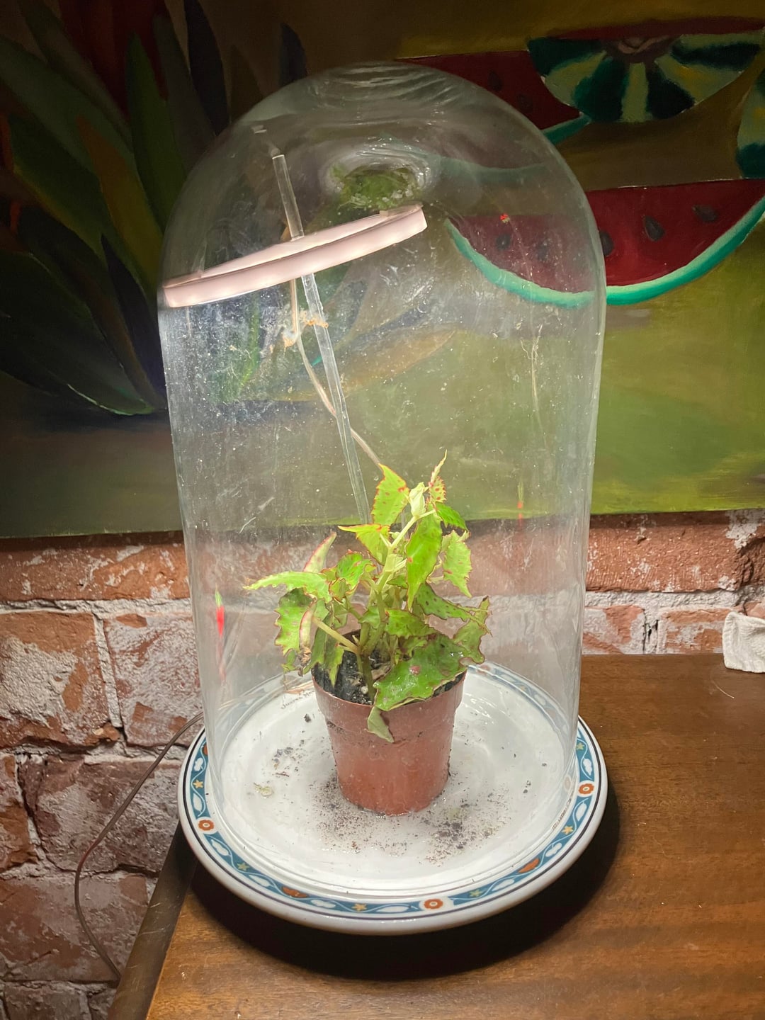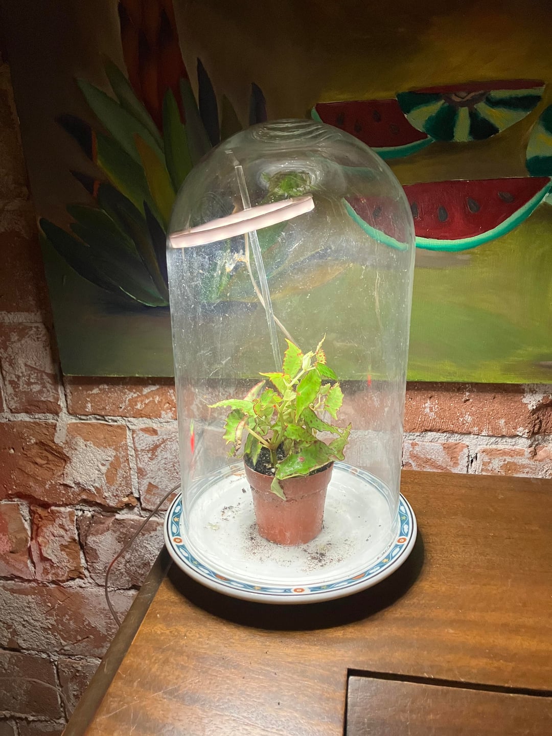 Found this little guy at a freakin grocery store (on the nicer side of town, of course; my grocery store of the same name on my more run-down side of town sells more basic plants & they never seem to get shipments in as often…) in one of those plastic tubes you see Venus fly traps in, listed as a starter plant 🥺! For an amphioxus this looks like much more than a starter plant! I used to have an amphioxus a friend gifted me a cutting of a few years ago and I had killed it before getting it to root & never thought I’d find another very easily without having to order online. I am staying at my mother’s but when I get back to my apartment I plan on making a terrarium for it. In the meantime I found one of my cloches at her house & a box of some of my cheaper old grow lights for this temporary mini set up.