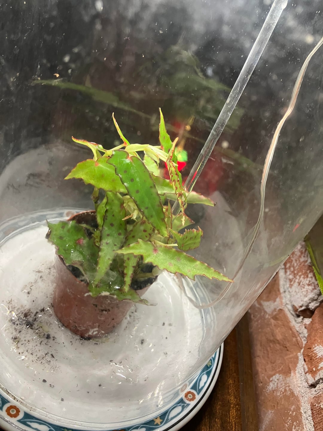 Just from my recent experience (I do know some begonias like 100% humidity sometimes but I can’t speak for amphioxus), I’d find something to very slightly tip the cloche up for mild gas exchange to avoid rot or mold/funk