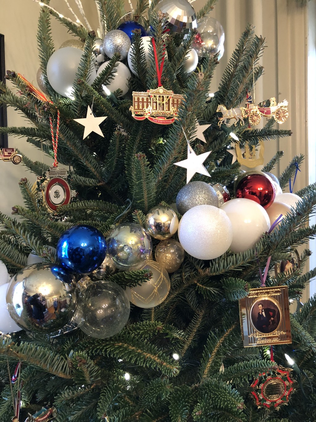 On one of the trees in the kitchen was Mrs. Branco’s Christmas spoon collection. Here the members used the spoons as ornaments, then integrated tea balls with dried flowers, cups, and garland to make a unified theme. The chairs at the breakfast table are vintage church chairs from St John’s Episcopal Church in Norristown which Mr. Branco refinished and then rushed. Garden club members festooned the backs of the chairs (which had originally contained hymnals) with festive seasonal décor.