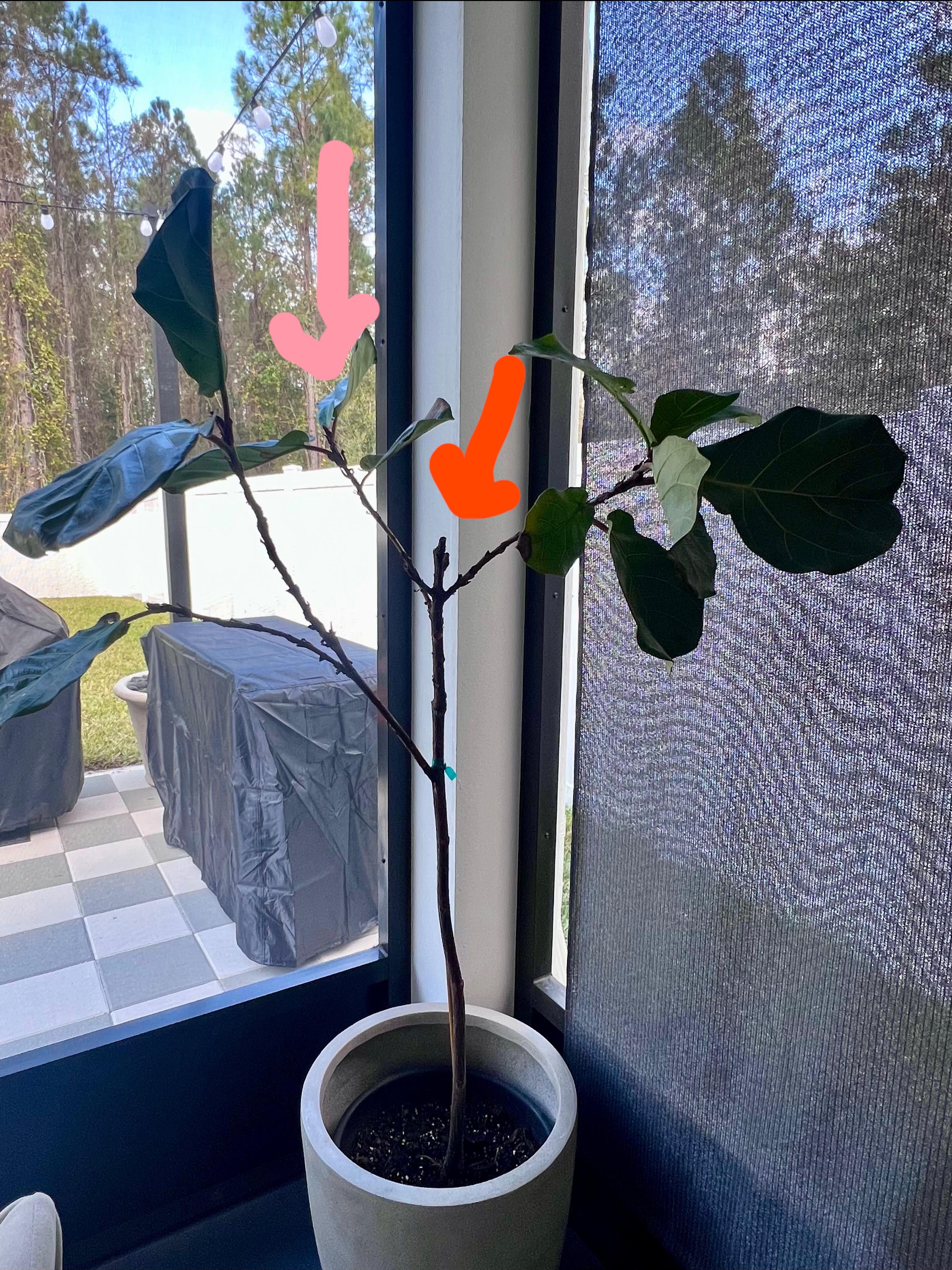 I’ve had this fiddle fig for over 2 years. Never grew a new leaf. A few months ago, majority of the leaves started falling off. I decided to repot it and cut the branches with zero leaves left (red arrow).
