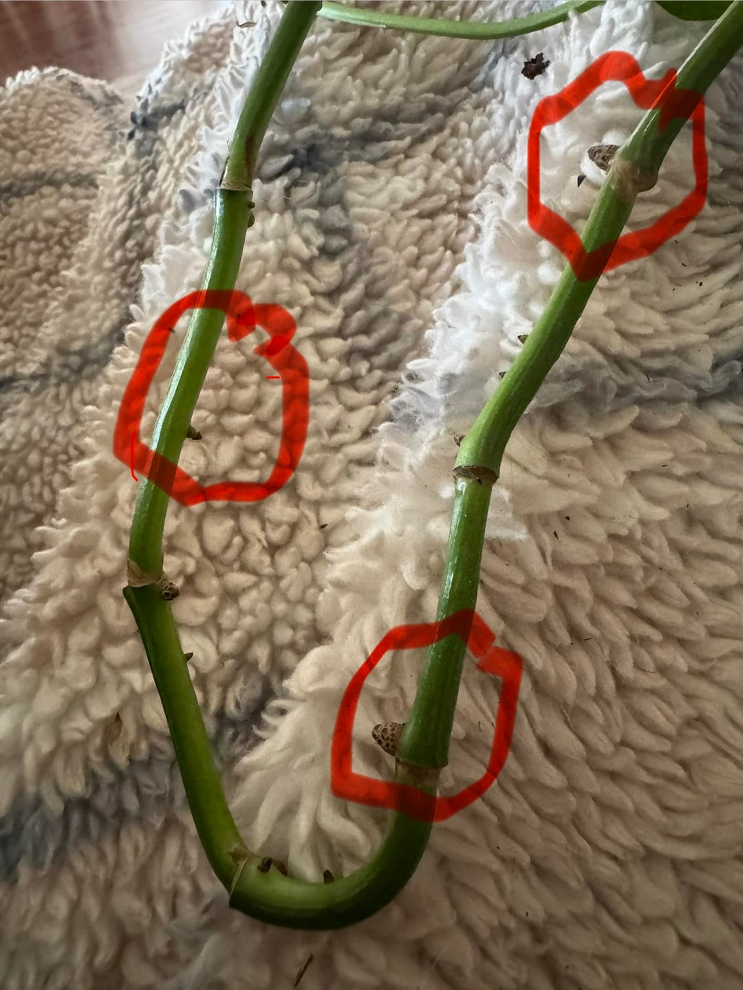 So since there is a lack of leaves, just putting those in water may not go well. I always recommend moss / propbox. I have had so much success with root growth and overall high propagation rate using it. When i did my lime philo Brasil i cut in between each node and had about 20 cuttings. I placed them in my propbox for around a month or so and now i have a whole pot full. I’ll attach a pic