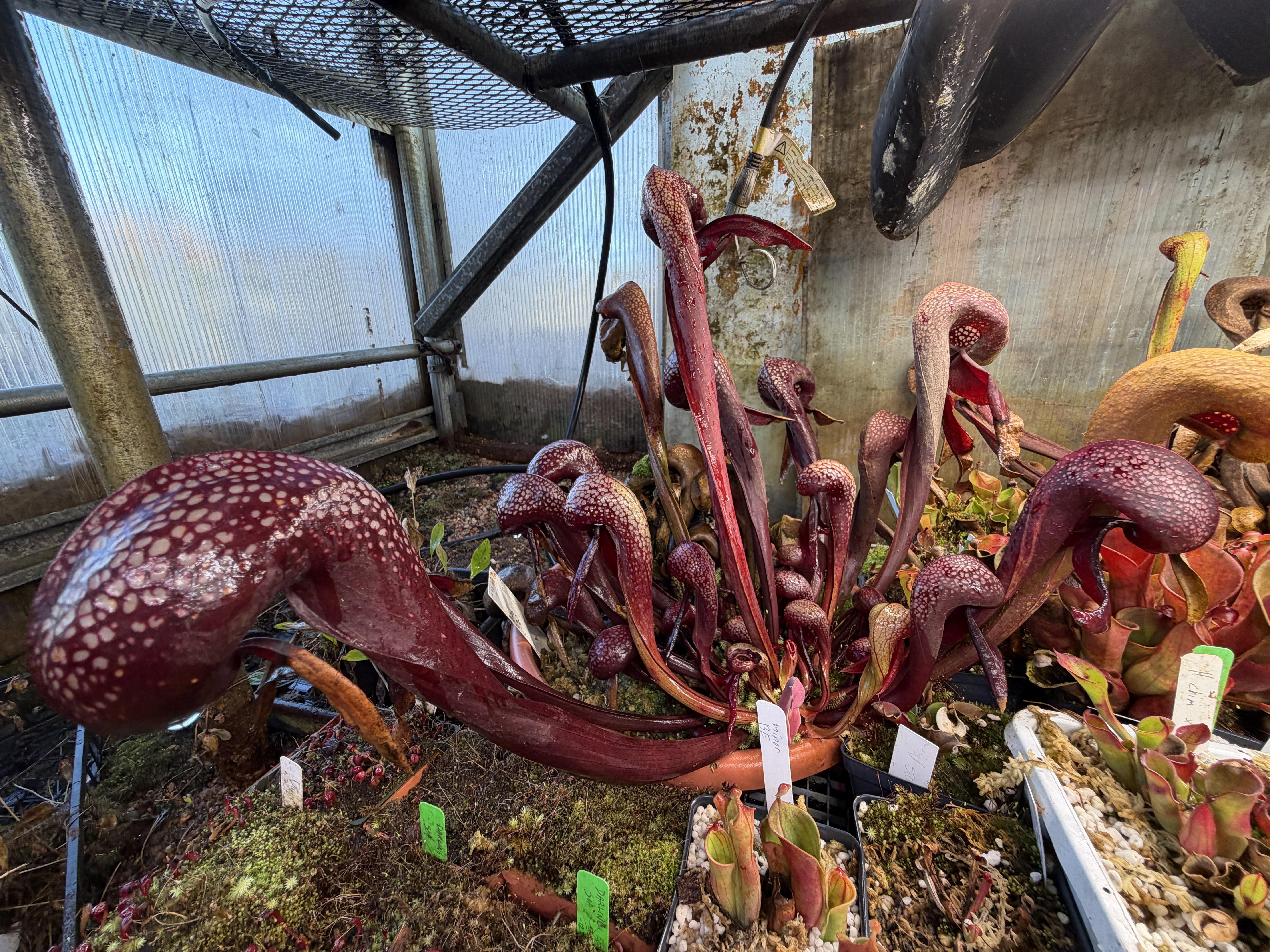 My Darlingtonia californica (aka Cobra Lily) pot is absolutely killing it on the far north side of the greenhouse this winter. Kept them in the coolest, spot to mimic their native Oregon/California mountain seep habits, and they’re rewarding me with some of the deepest red coloration I’ve ever seen. Those hooded pitchers look straight out of a sci-fi horror flick—twisted fangs and all.