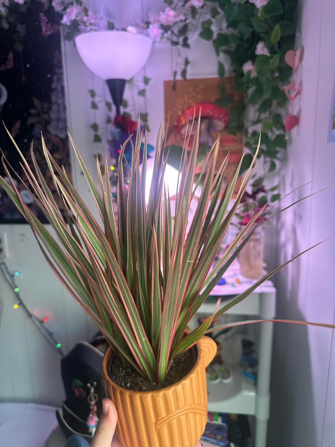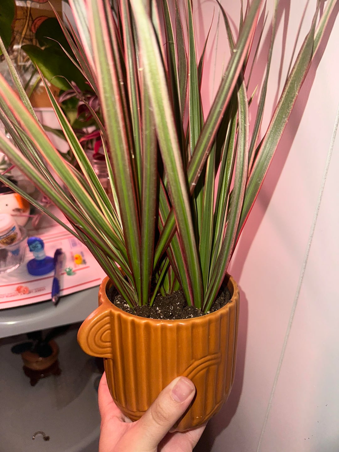 Dracena marginata. That’s the pink edge version, but there is also a lime-striped version and a burgundy one. Very easy care. They love lots of light, and the more sunshine they get, the brighter the pink will be. Otherwise, water it when the soil is totally crunchy dry. If you forget a couple extra days, it will be fine. Just don’t leave it in really soggy soil.