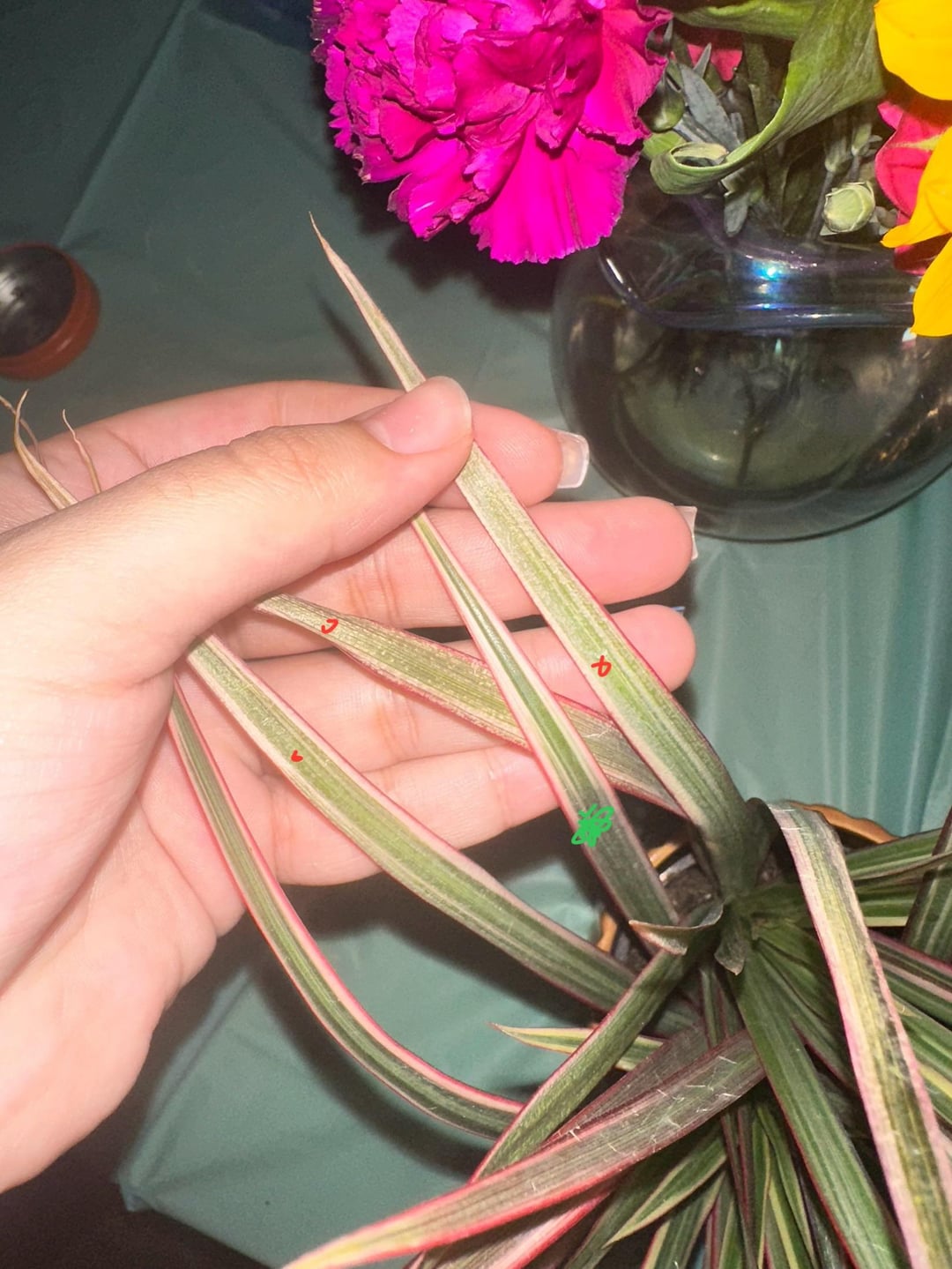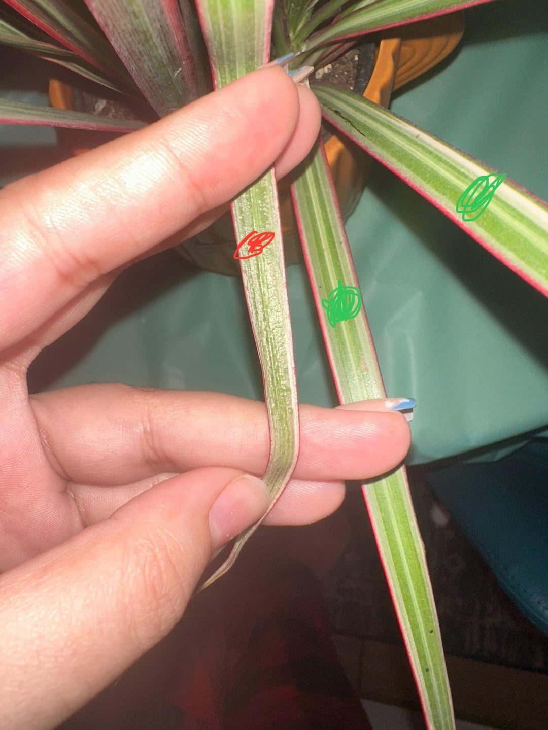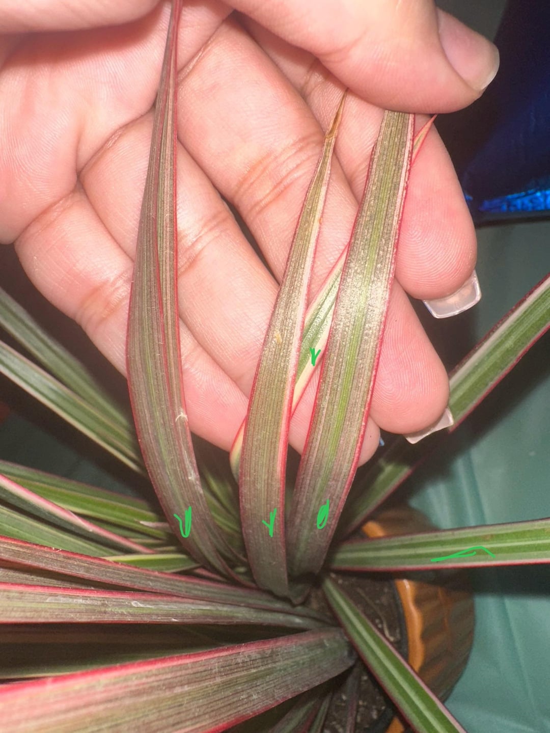 Friend gifted this as a bday gift, I assume it’s some type of african spider tree, based on the tag but google isn’t doing it justice. It’s only been 3 days, friend mentioned it was from Fred Meyers. I’ve noticed this weird pattern on the leaves recently🥲 I’m not quite sure if it’s dehydrated or what? I tried to capture what the healthy leaves kind of look like with the green dots/red dots are the sad leaves . The soil is still some what moist (68% dry, top of soil dry but if I dig its moist) and I’ve got a grow light on it not too close for about 12hrs a day since it’s a lower brightness light bulb. Also it’s seems kinda grouped together? With 3 little bunches should I separated it and repot in the middle of winter?