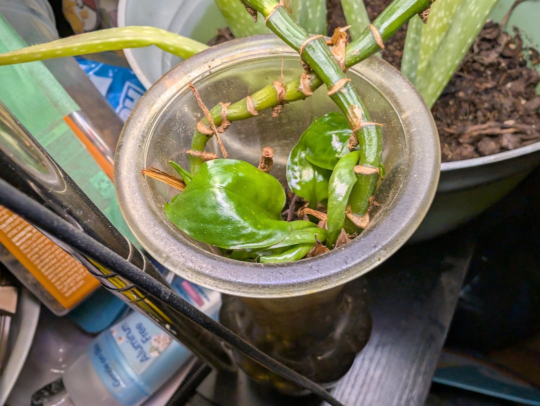 My dad had this cutting on his windowsill for 3~5 years. The plant it came from is dead now but used to sit on top of a stool on top of a table in the window and had leaves that were almost as big as my (F) palm to full hand with sections between leaves or vines coming off that we're about as long as my finger, in a big tower of plant the last time I saw it alive. I found a picture of the original plant from the '80s but it is not very visible and isn't useful visually, but I know it was at least ~40 years old when it died. My father died earlier this month so I can't ask him.