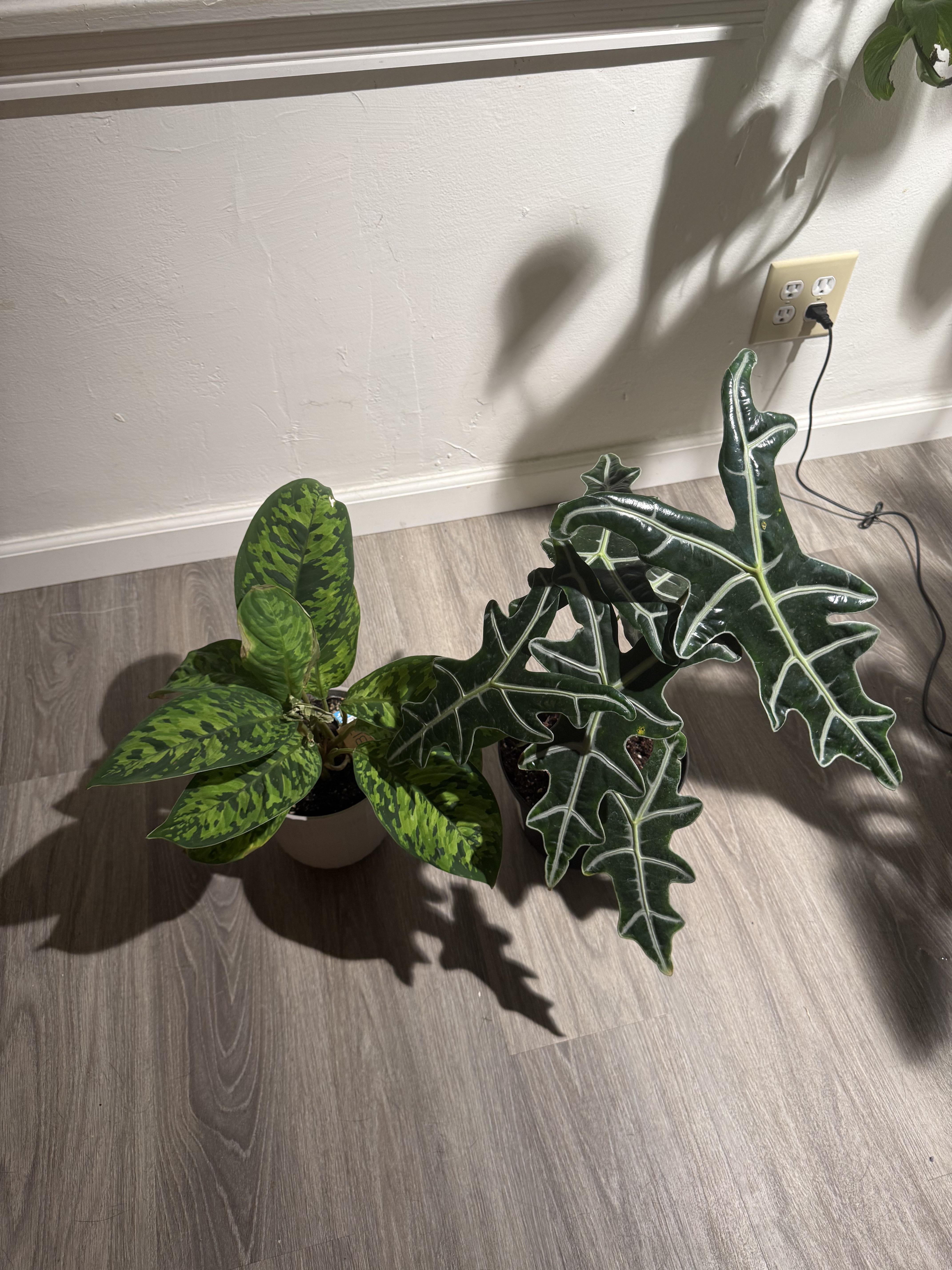 Left is possibly a Dieffenbachia ‘Reflector’ (not my best genus, don’t quote me, could also be an Aglaonema), and right is an Alocasia sanderiana