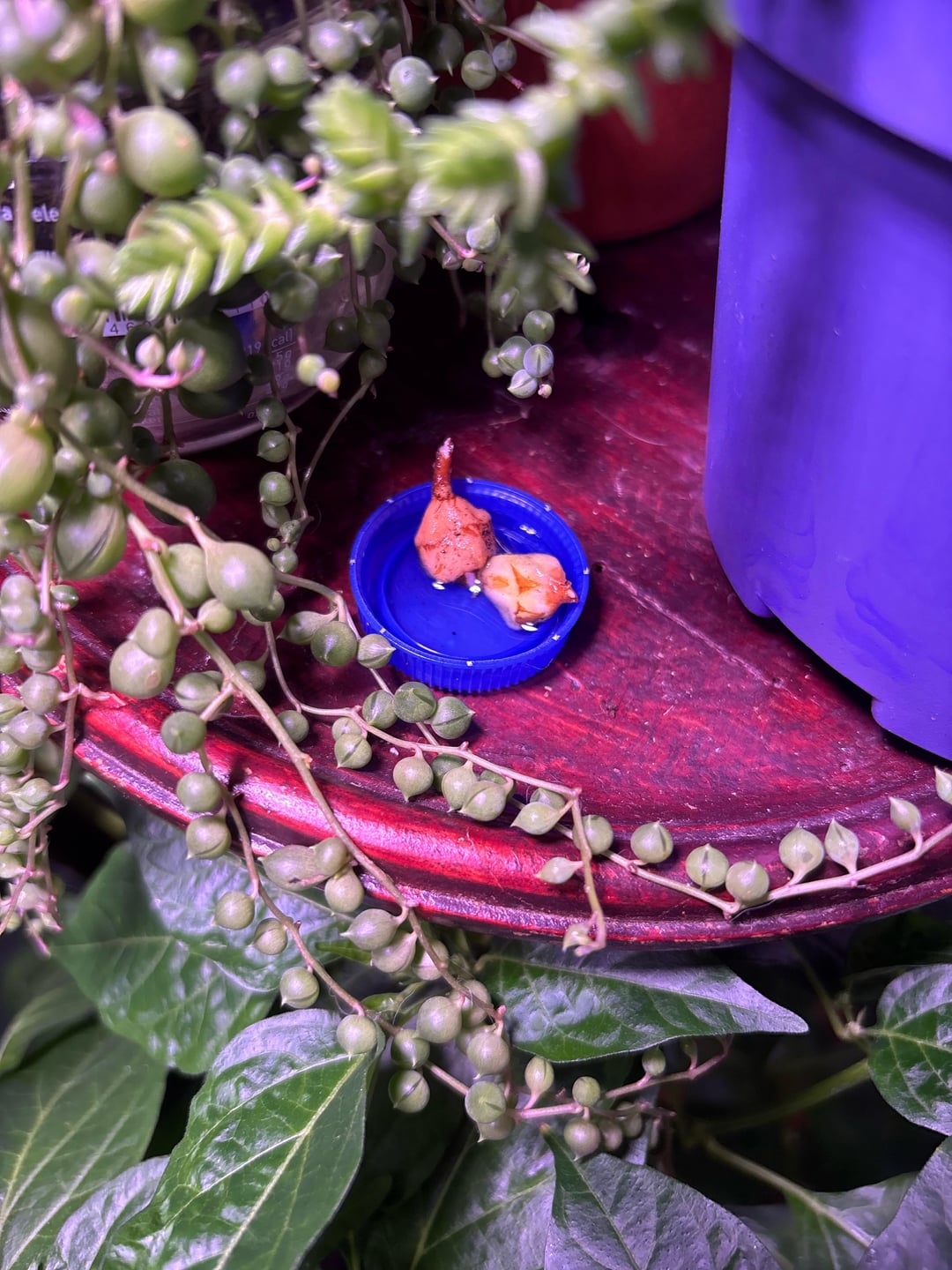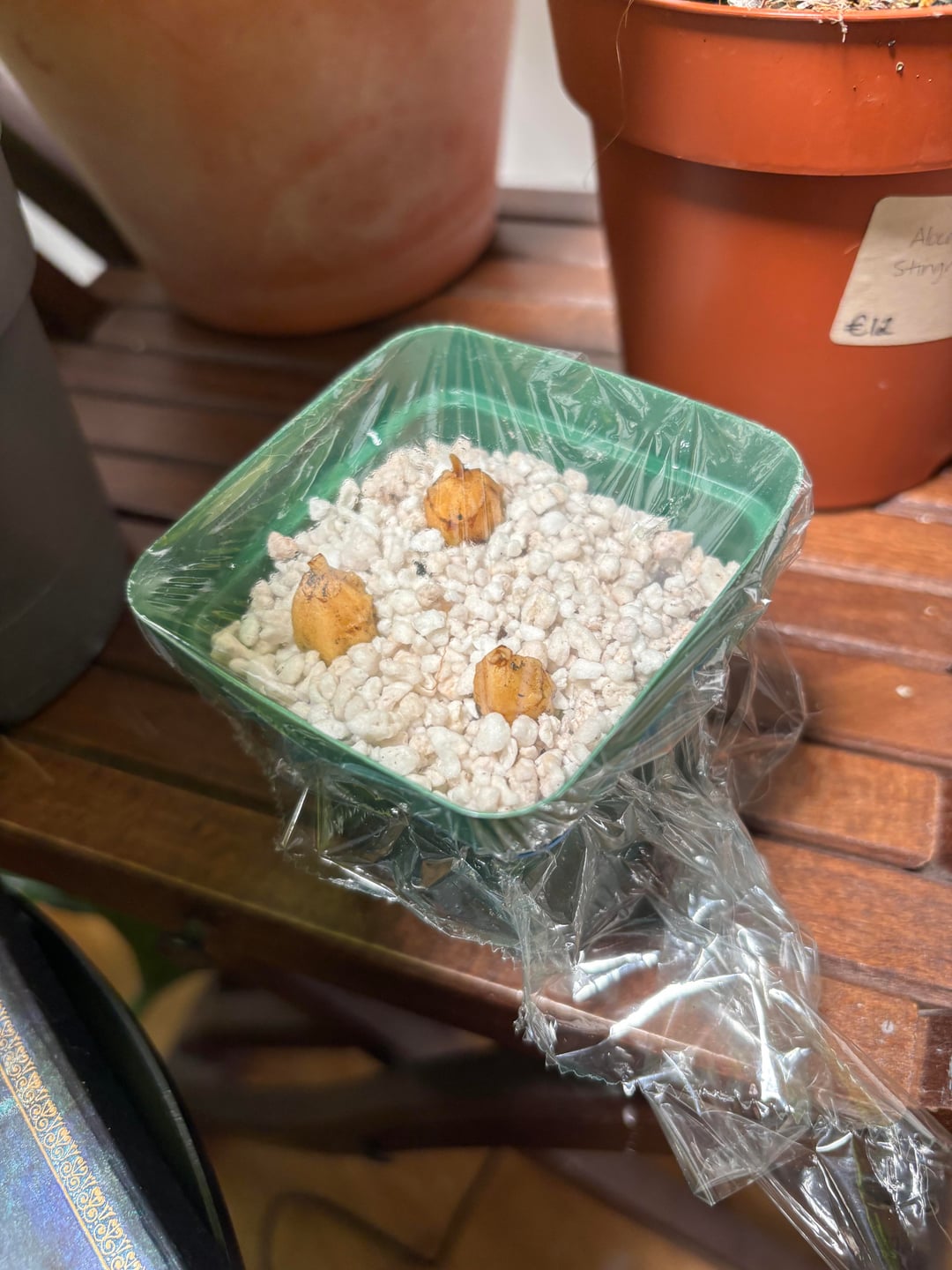 Sooo hey guys! I’m so excited that I found five corms on my young variegated Frydek, but I’m very unsure what to do. I put two corms in a bottle cup half filled with water, without any coverage but under my strongest light. Three others are now in wet perlite unter a holed plastic foil. Any Tipps? Should I put water underneath the perlite pot so it’s always moisturized? Is it okay to leave them uncovered (I have a stable 60% humidity in the bedroom)?