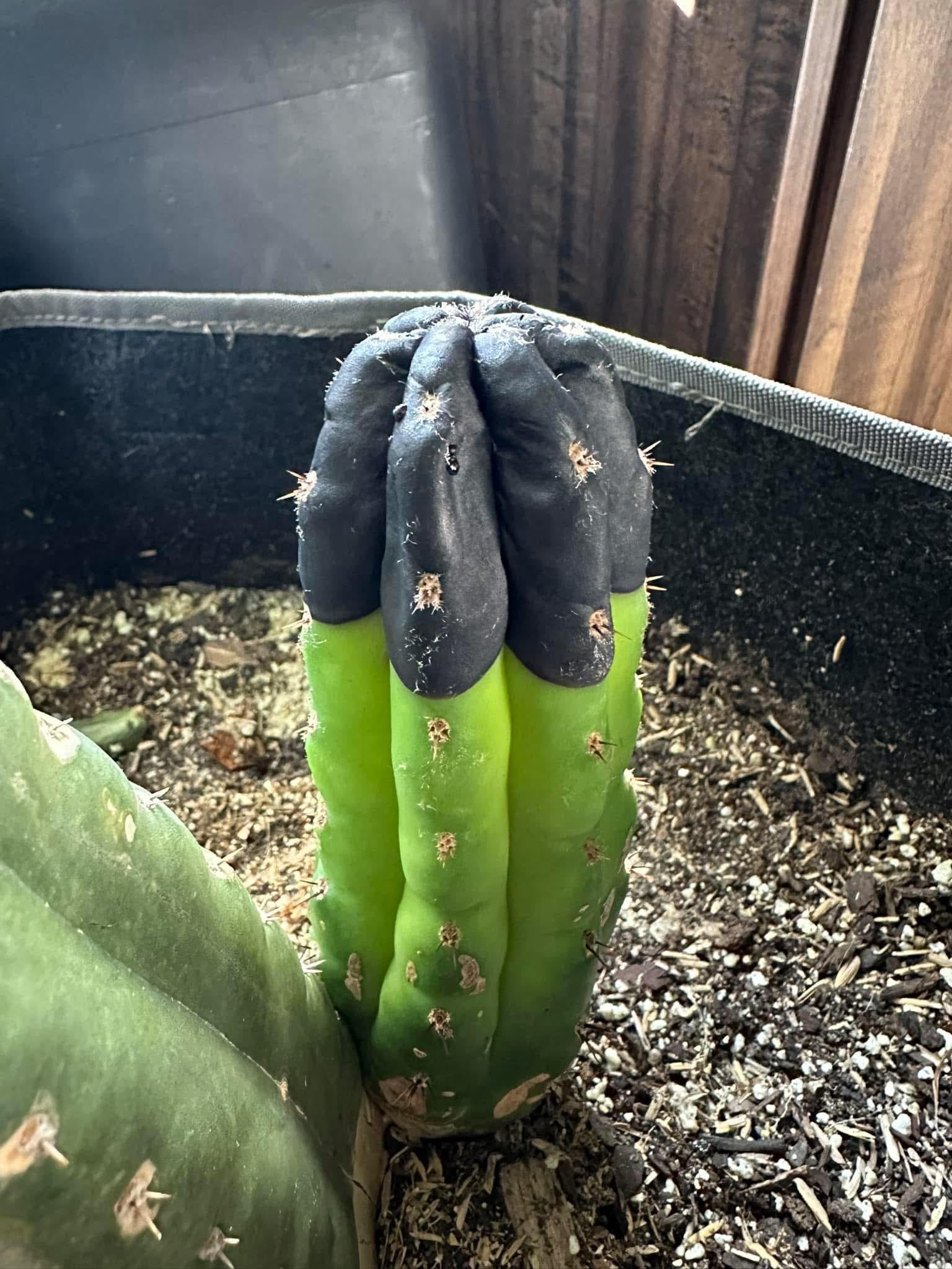 Cut an inch below black, if it’s not 100% clean healthy flesh, sterilize knife and slice and repeat. Keep dry, direct sun on fresh cut area should allow for proper callousing.