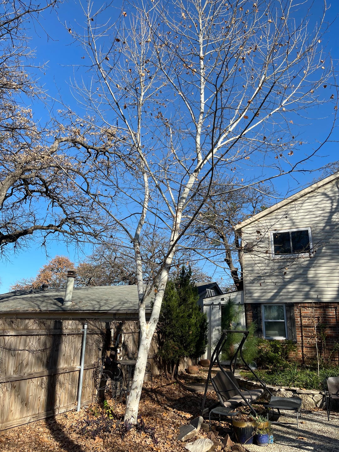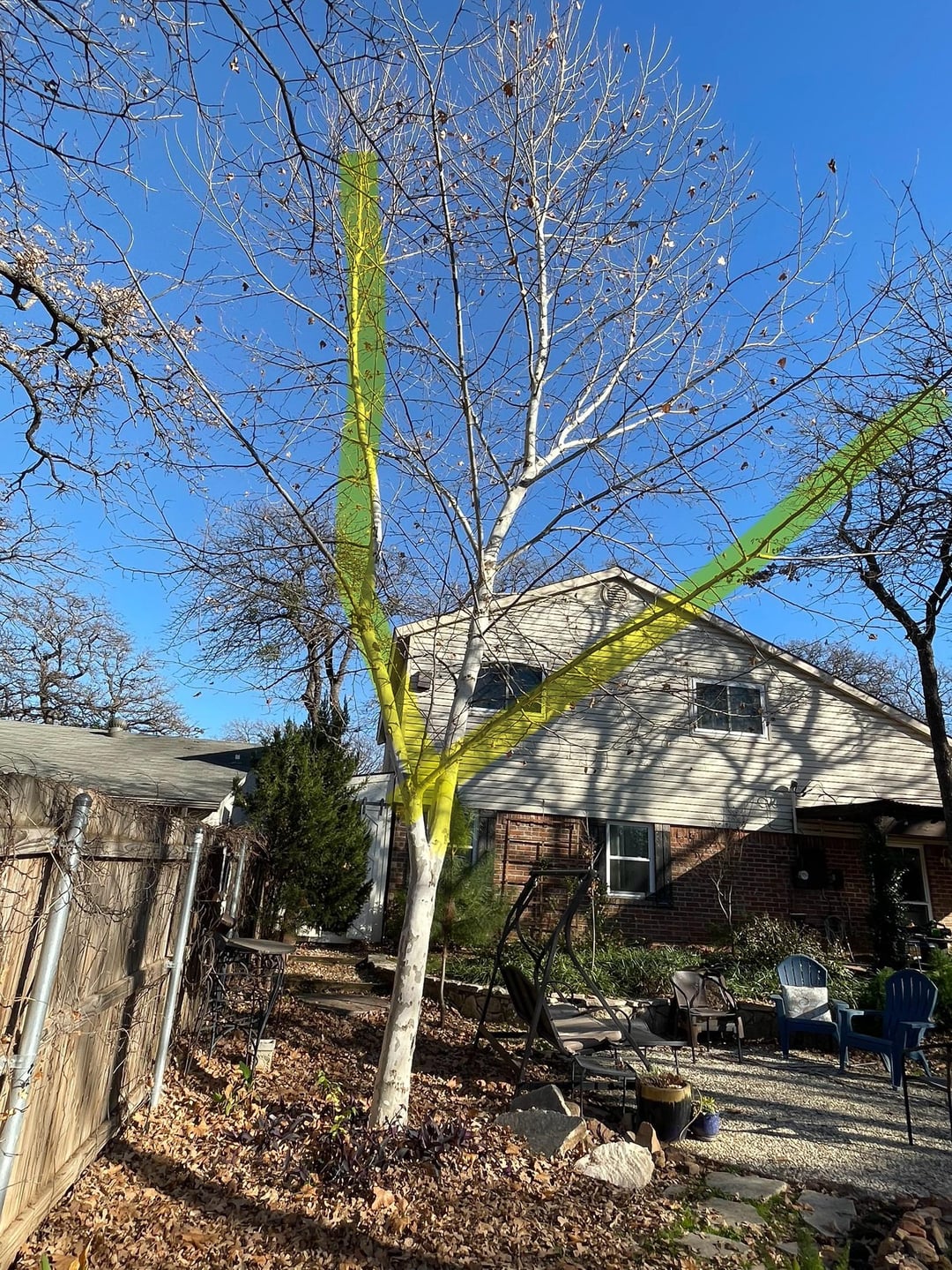 My American Sycamore tree has always leaned slightly towards the house. I’d like to give it a good trim, but I’m not sure what should stay or go. It splits into two main trunks (competing leads?) at about 6 feet high. Should I cut off that second large vertical branch?