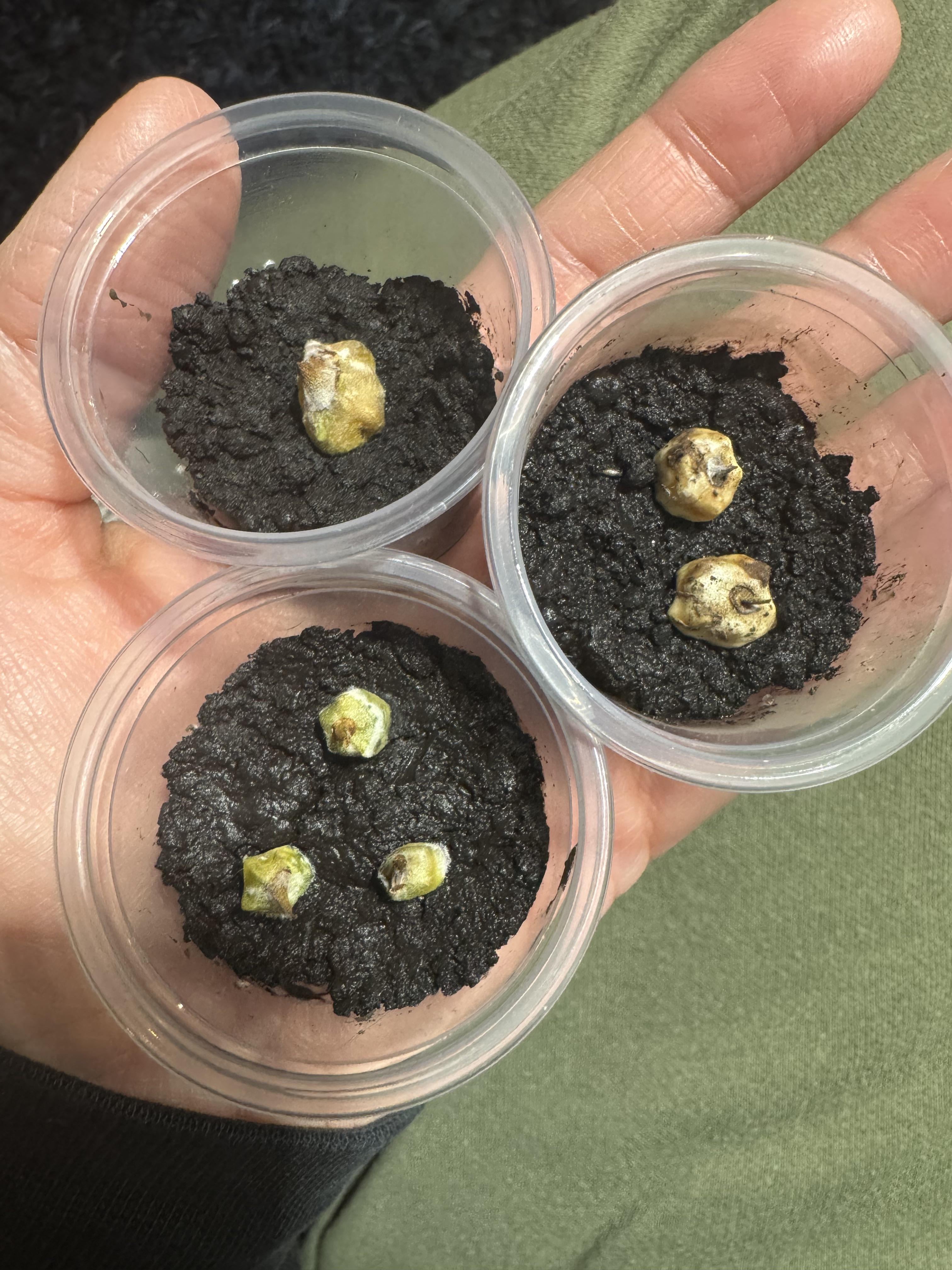 I need help. This is my first time trying to get some roots growing from corms, they’re sitting in some fluval stratum, I’ve poked little holes around these little cups and in the lids but it doesn’t seem to be working or do I lack patience ? Should I get some sphagnum moss ? Also they seem to be growing little fuzzy mold but this soil dries out so fast so I’m not sure how to mitigate that.