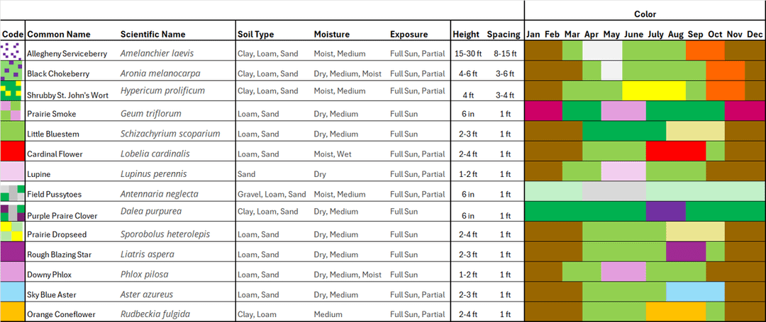 As the title implies, I'm planning on converting part of my front yard into a native garden and I'd like some feedback on design and plant choice before I commit to ordering any plants. I'm located in SE Wisconsin near the border between zones 5b and 6a. My soil is a mixture of clay and loam, but I plan on supplementing with some topsoil when I rip up the grass. The yard is full sun, with the front of my house facing east.