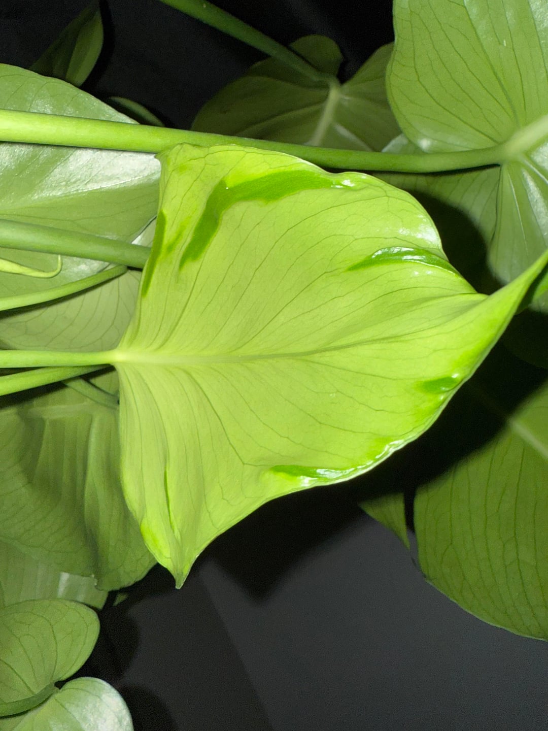 Oooh this looks like spot variegation! Totally harmless and just pretty cool, cosmetically. The light green color in the fourth photo is just from the younger leaf. Newly unfurled leaves will be lighter in color, and thinner in weight. They will thicken and darken as the rest of the plant over time.