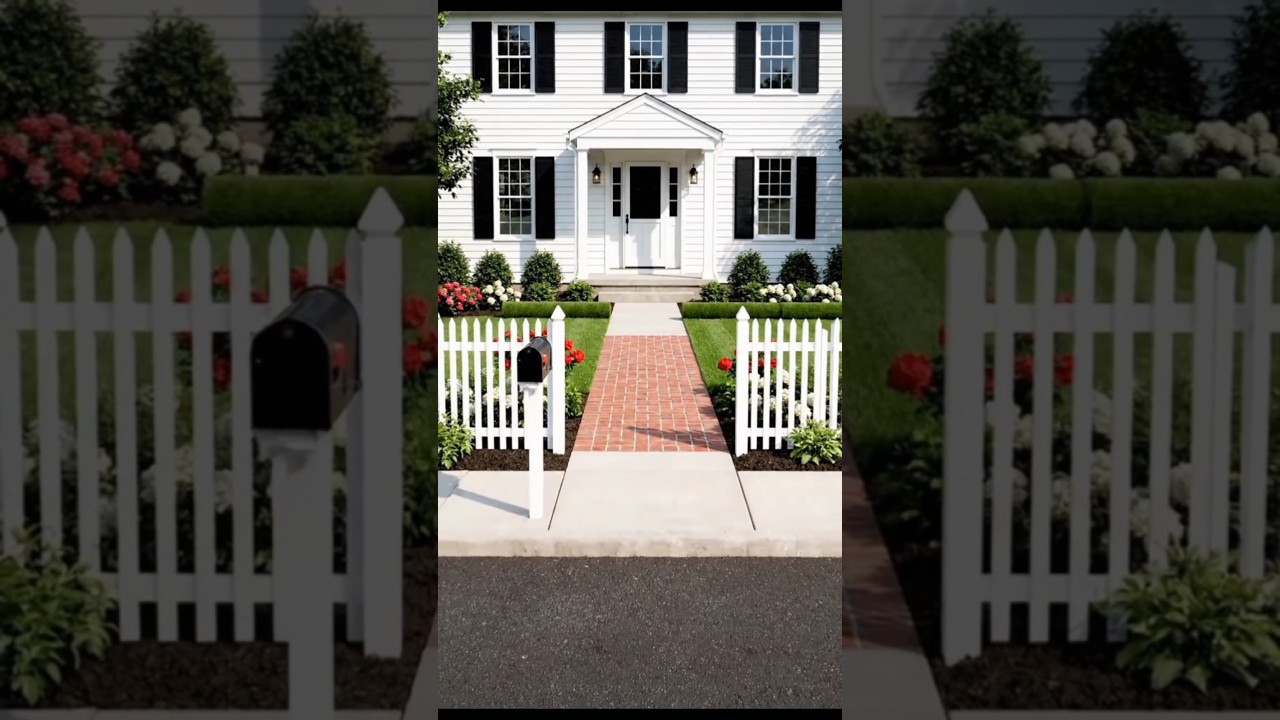 This transformation showcases a brick walkway, white picket fence, green lawn, and symmetrical landscaping, creating timeless curb appeal.