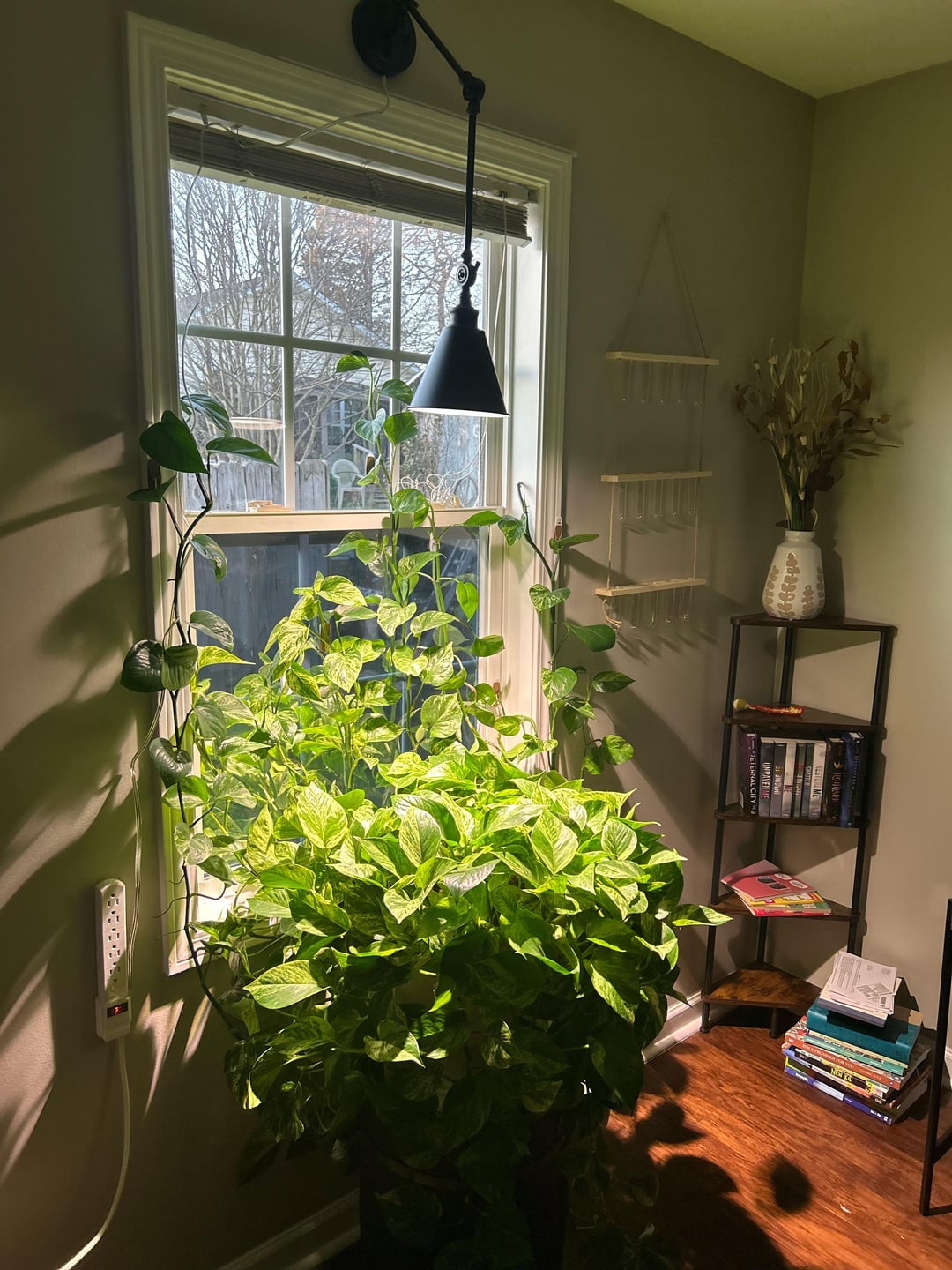 Got a nice wall mounted light and put a grow bulb in it and pinned her to the window with command hooks. It’s on a barrel I thrifted in a big 4 gallon urn. Other golden pothos and smaller marble queen in the kitchen with grow lights/ bulbs