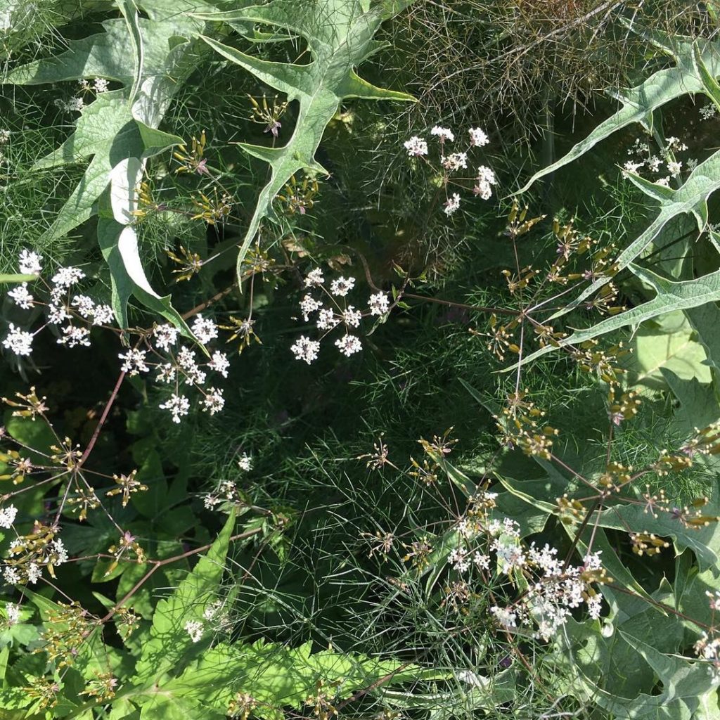 Flower head of Anthriscus sylvestris ‘Ravenswing’ alarmingly surrounded by the jagged foliage of the cardoon, Cynara cardunculus #greatdixter #perennialplants #gardendesign #jamesleedesign