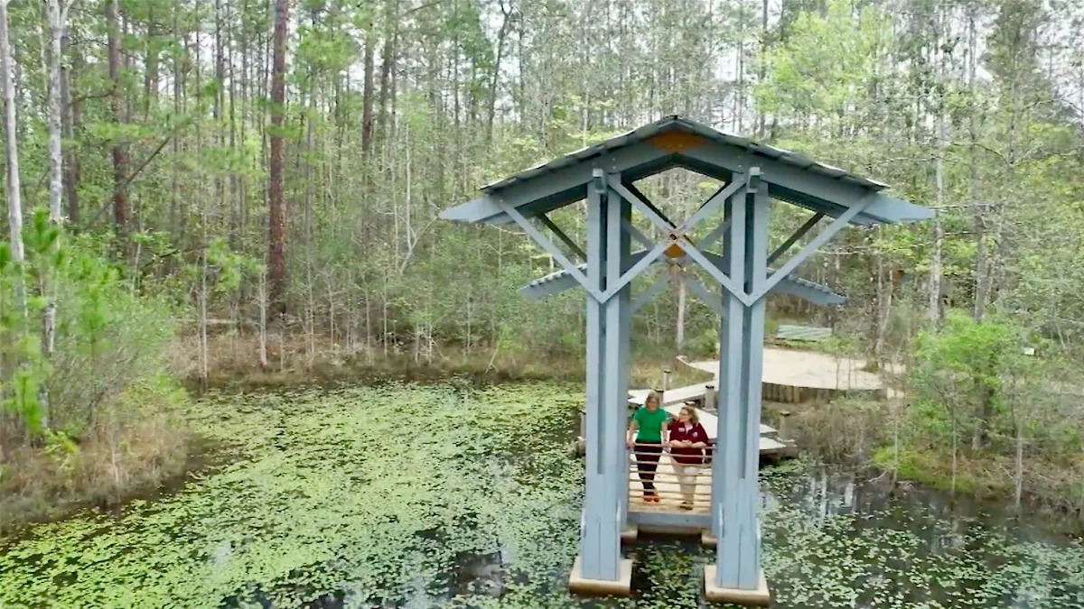 Woman walking across bridge at the Crosby Arboretum – MissStateExtension/YouTube