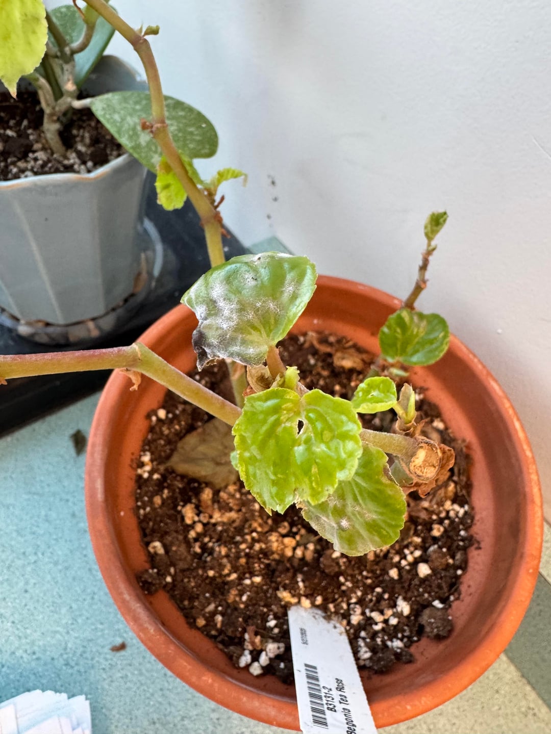 This is my tea Rose begonia. I don’t know what’s wrong with it. I was told it was too cold for it even indoors so I moved it away from a cold window, but it’s still doing the same thing. I stopped giving it water because I thought maybe it was too much. Could it be a lack of light?