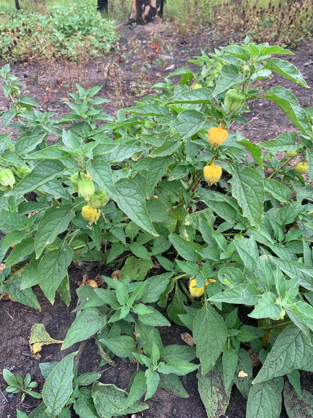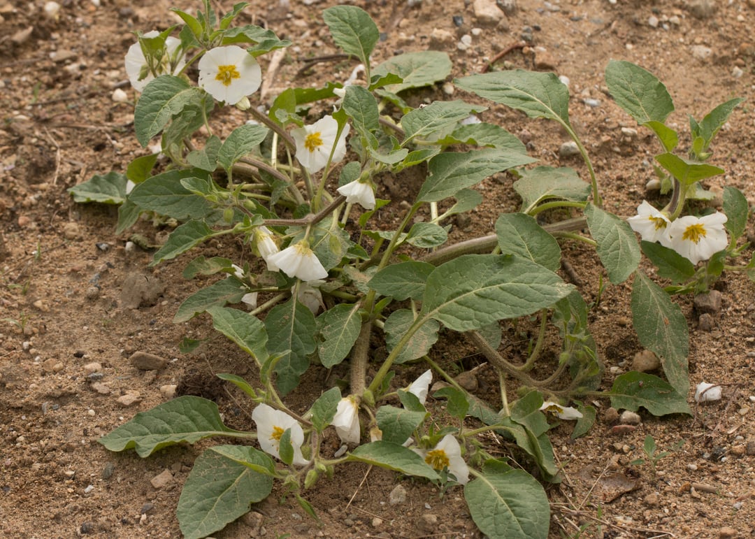 Grows up to 3 feet tall in full sun, in sandy/gravelly naturally or un-naturally disturbed areas. The leaves are sticky and hairy. Unlike Physalis its fruit is not contained within a lantern, rather the calyx enlarges with the fruit and is open at the tip, both turn yellow as it matures.