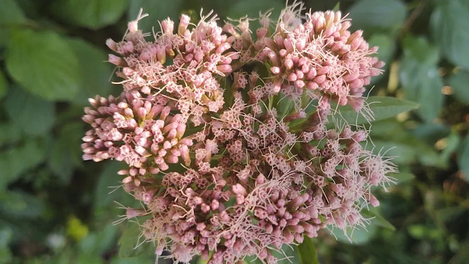 Hollow Joe-Pye weed is a disease-resistant perennial plant that produces clusters of pinkish-purple flowers. It grows up to 7 feet tall and prefers moist, well-drained soil in full sun to part shade.