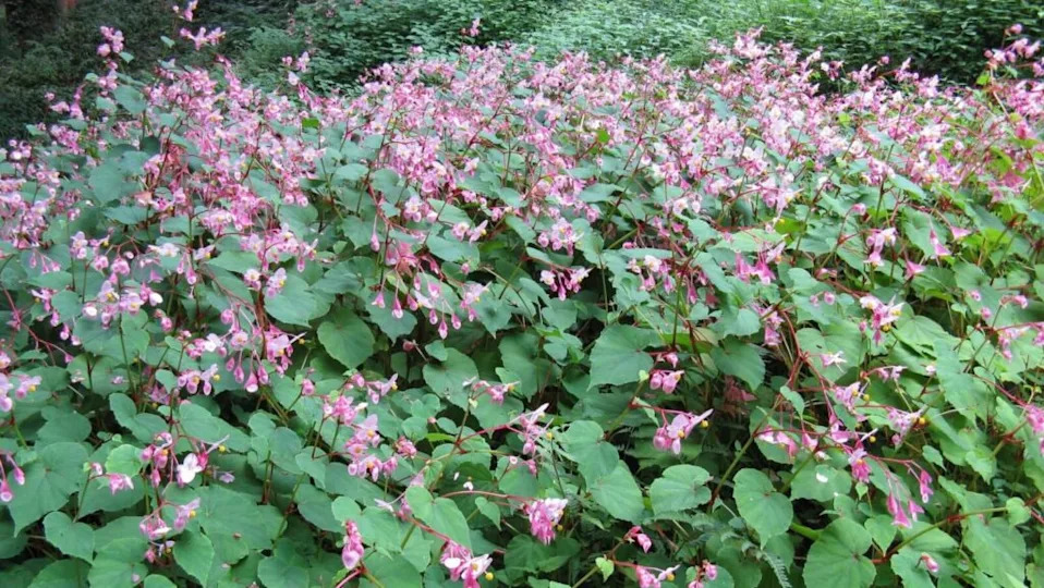 With heart-shaped leaves and delicate flowers, hardy begonia thrives in partial to heavy shade and moist, well-drained clay soil. Works well for zones 6-9.