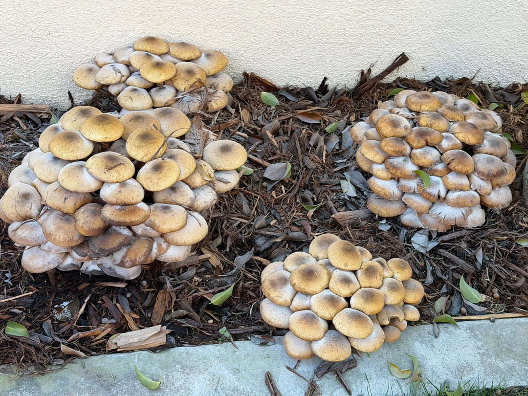 Mushrooms almost never kill a tree, but when they’re growing on the trees, it’s usually a bad sign. Here, you’re totally fine. Fungus doing what it do, turning mulch into soil.