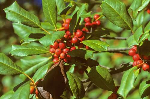 Native along the entire East Coast and west to Missouri and Texas, this slow-growing, pyramidical holly can reach 25-60 feet (8-18 meters) tall at maturity. Also known as Christmas holly, the spiny-leaved plants are hardy in zones 5-9, tolerating both sun and shade but requiring acidic, moist, well-draining sandy or loamy soil.