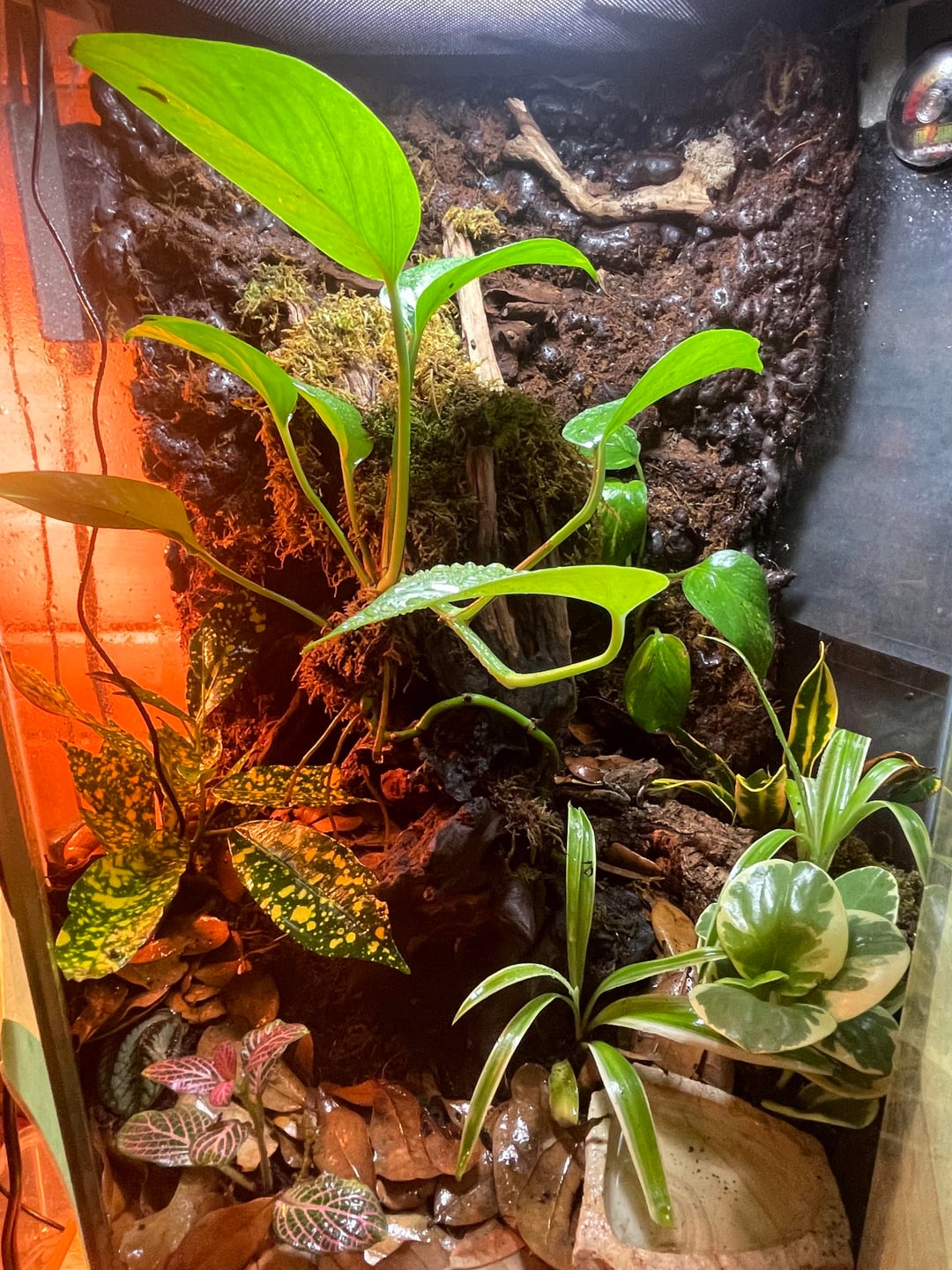 4/5/6. “The Baby Tank” (AKA Jurassic World) looking perty with my warm bed lights shining through my diy cat-proof glass covers.