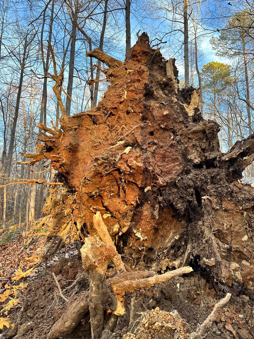 Red Oak? I’ve been to several job sites where we pruned healthy crowned red oaks a few months prior and upon return they’re uprooted. Always on hills or bluffs.
