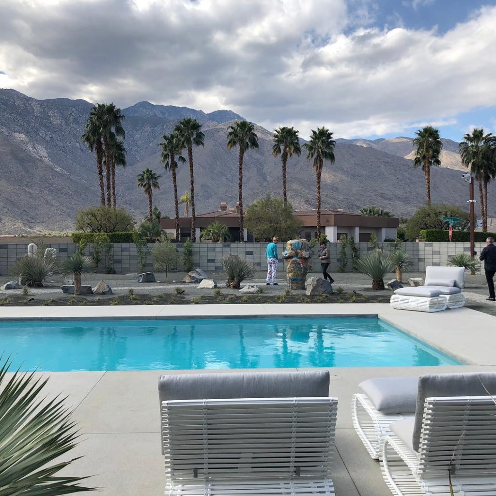 Facing west with the palms and the mountains in the background, your favorite cocktail in hand- not too bad @modernism_week #palmsprings #outdoorliving