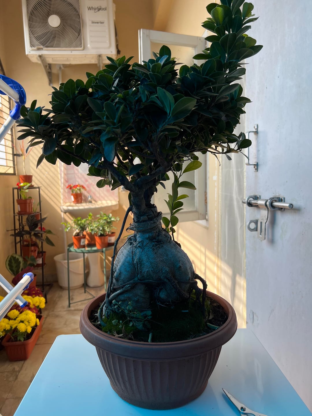 So I picked this Ficus Ginseng Microcarpa from a nursery for $25 the other day I’m contemplating on the pot that I should go for at this current stage. I’m thinking two extreme options – one is the ceramic pot that’s a rectangular pot with 8-10cm depth, and the other is a large plastic plant pot that’s 30cm diameter and 35 cm depth.