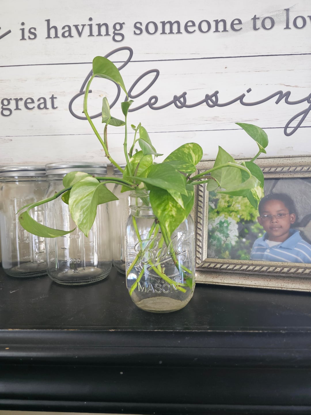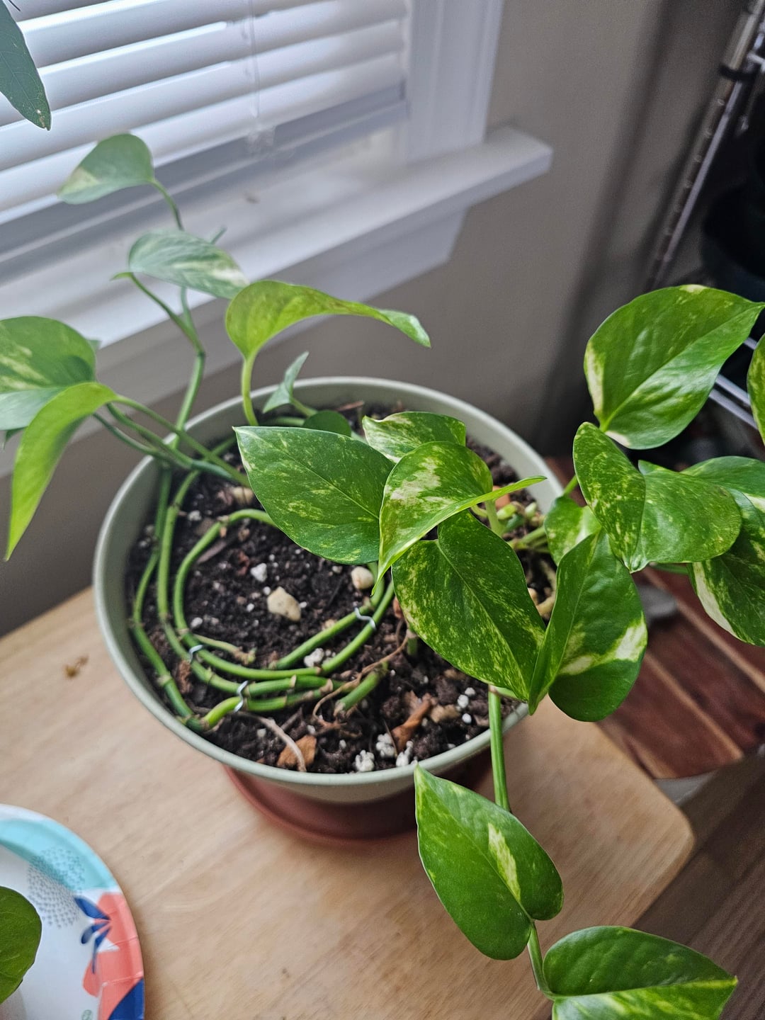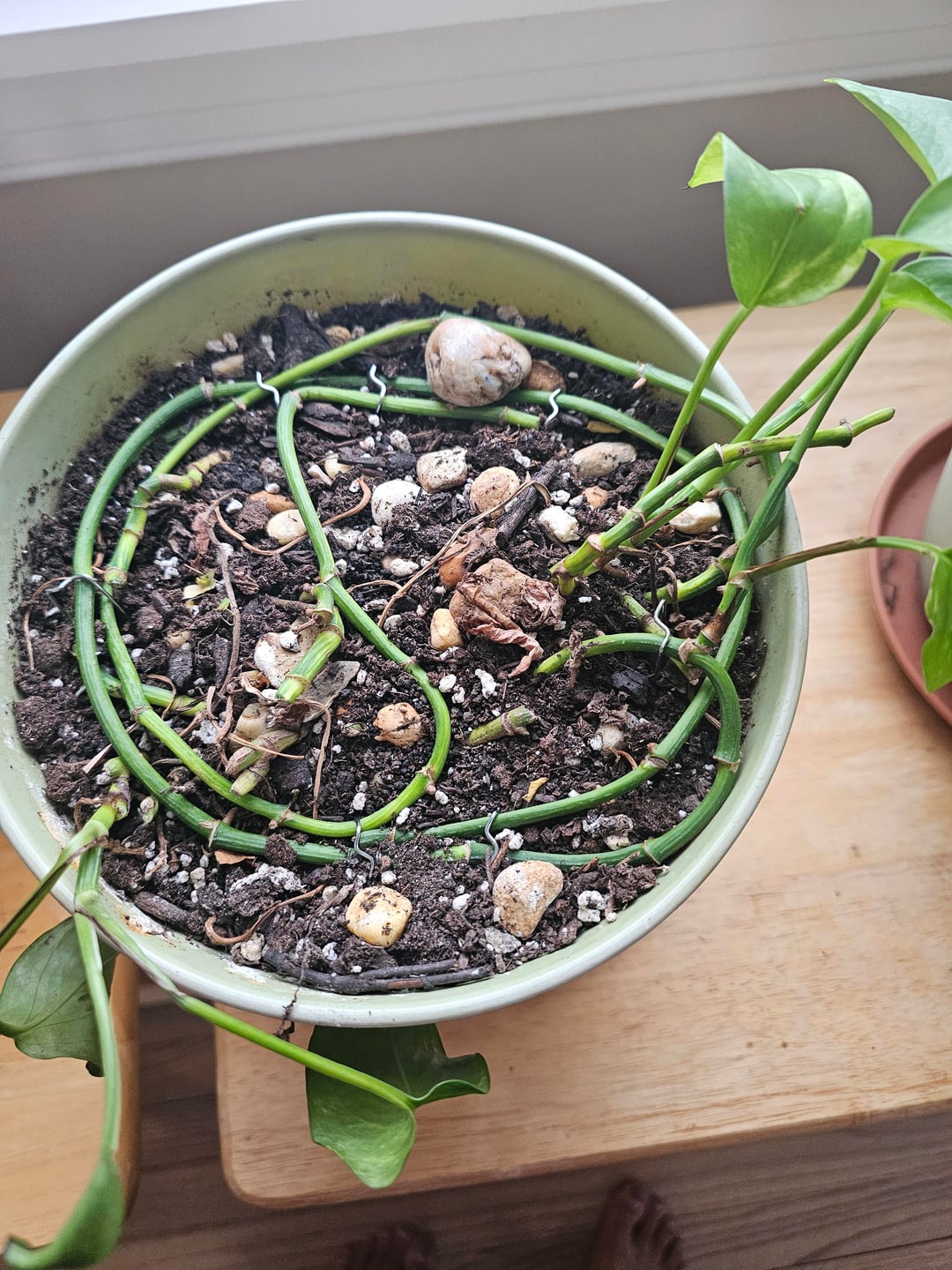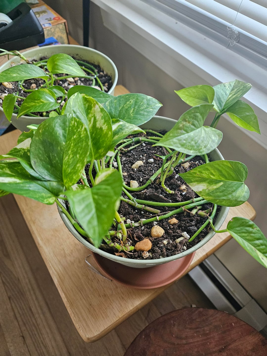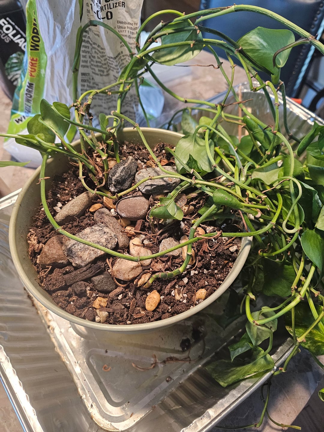 These are my step mother's plants, Glory and Georgia. My stepmother passed in late October and her plants were out on a screened-in porch for the last couple of months. We've had single digit weather. My sister asked for help and I brought them home. They were in bad shape with cold damage and literally had like two very long vines with runners with no leaves in many places. I had to chop because after having it here for a couple of days, watered and in the heat, I saw that there was no hope for many of the leaves. My sister isn't happy about that but I have faith that they will end up being just fine. 1-3 is before and 4-7 is current. It's been a week today. She was also a rock collector, like me, and these pots are chuck full of them.