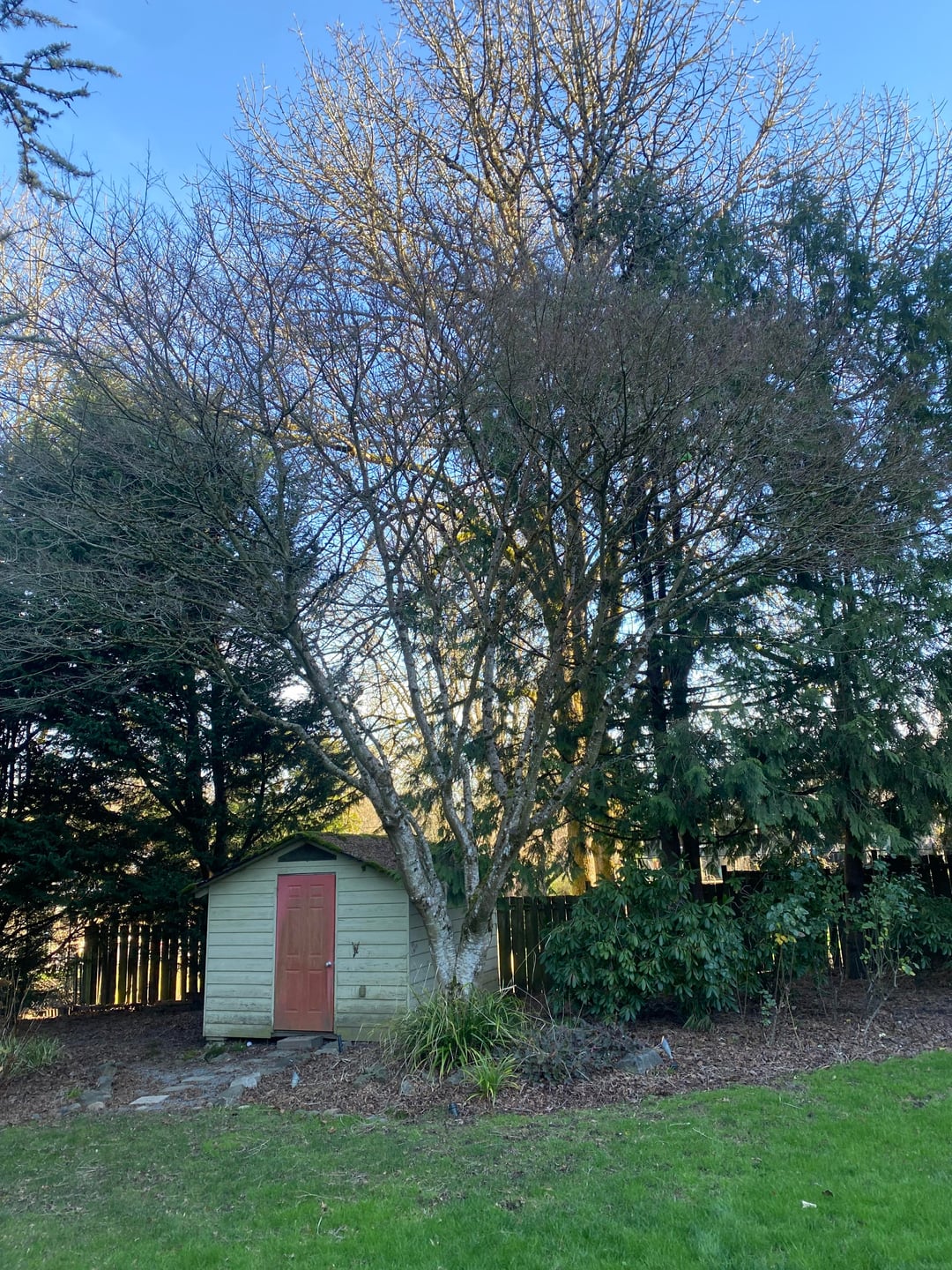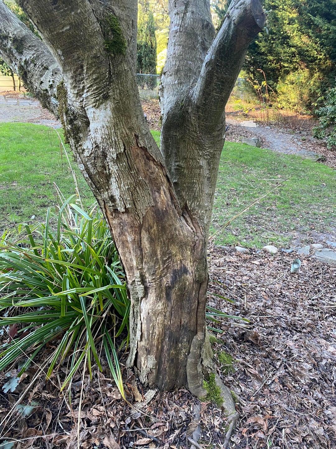 Moved to new house in October, nothing seemed wrong with the tree until I walked around the back and saw the bark missing from a large section. I guess the leaves fell off the right hand (left in first pic) side a little faster. There’s also a crotch where I’m guessing it may start to rot. It’s not threatening any structures besides that shed that already needs a new roof, so I’m not stressed about taking it out, just curious how long I might have the thing about a replacement/if I should plant another tree close by. Bonus points to anyone who can spot the dog poop bag one of the kids who used to live here must have thrown up in the tree last summer.